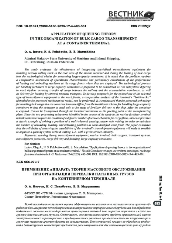 1. Изотов О. А. Обоснование возможности обработки контейнеризированных навалочных грузов на морском терминале / О. А. Изотов, Н. С. Полуботко // Вестник государственного университета морского и речного флота имени адмирала С. О. Макарова. - 2025. - Т. 17. - № 2. - С. 208-215. https://doi.org/10.21821/23095180-2025-17-2-208-215. - EDN HRYNBC.
