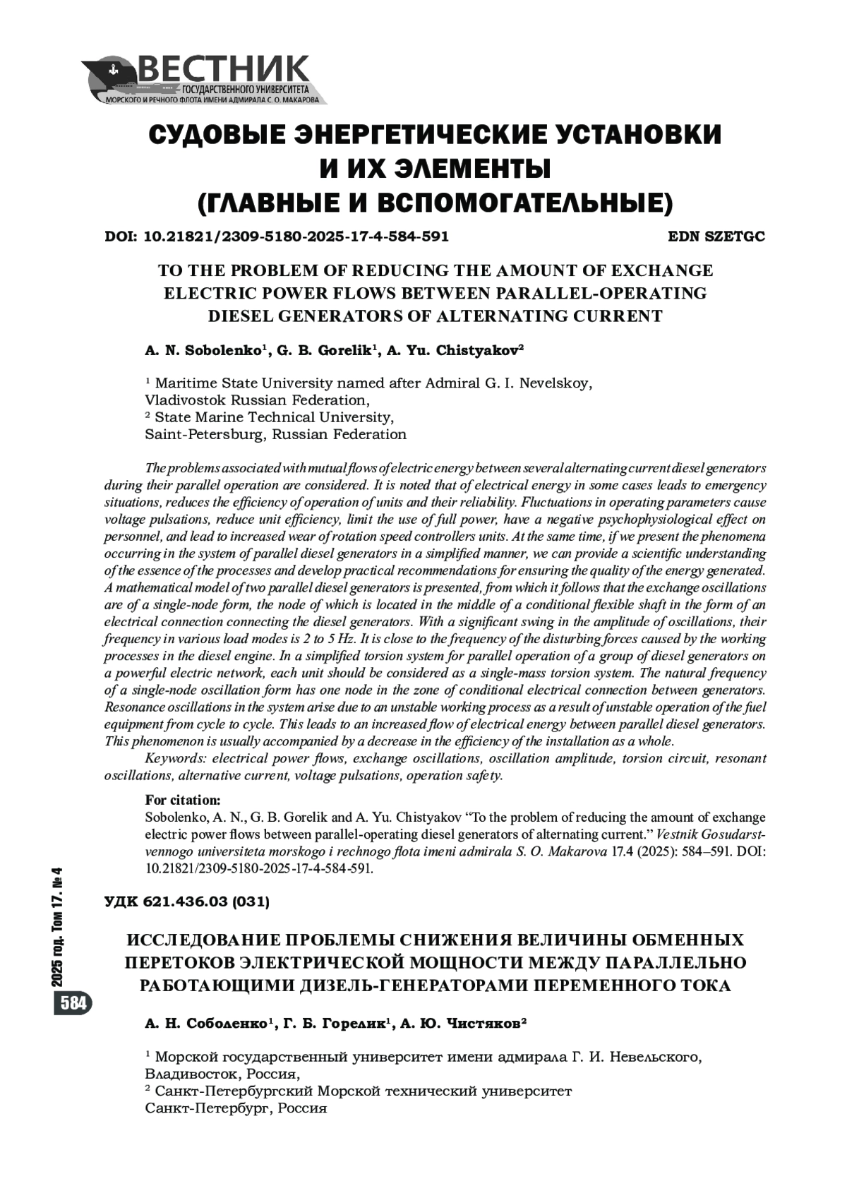 Рассмотрены проблемы, связанные с взаимными перетеканиями электрической энергии между несколькими дизель-генераторов переменного тока при их параллельной работе. Отмечается, что амплитуда электроэнергии в ряде случаев приводит к аварийным ситуациям, снижает эффективность эксплуатации агрегатов и их надежность. Колебания режимных параметров вызывают пульсацию напряжения, снижают коэффициент полезного действия агрегатов, ограничивают использование полной мощности, оказывают отрицательное психофизиологическое воздействие на персонал, приводят к повышенному износу агрегатов. Понимание сути происходящих процессов и физической природы обменных колебаний позволяют принимать соответствующие технические решения, выполнять опытно-конструкторские разработки и обеспечивать безопасность эксплуатации дизель-электрических агрегатов при их параллельной работе. Из представленной математической модели двух параллельно работающих дизель-генераторов следует, что обменные колебания, узел которых находится посредине условного податливого вала в виде электрической связи, соединяющей ДГ, имеют одноузловую форму. Обращается внимание на то, что при значительном размахе амплитуды колебаний их частота на различных режимах нагрузки близка к частоте возмущающих сил, вызванных рабочими процессами в дизеле. Отмечается, что в упрощенной крутильной системе для параллельной работы группы ДГ на мощную электрическую сеть следует рассматривать каждый агрегат в качестве одномассовой крутильной системы. Сделан вывод о том, что собственная частота одноузловой формы колебаний имеет один узел в зоне условной электрической связи между генераторами. Рассмотрены резонансные колебания в системе, возникающие из-за неустойчивости рабочего процесса вследствие нестабильной работы топливной аппаратуры от цикла к циклу, которые приводят к повышенному перетеканию электрической энергии между параллельно работающими дизель-генераторами. Это явление сопровождается, как правило, снижением эффективности установки в целом.