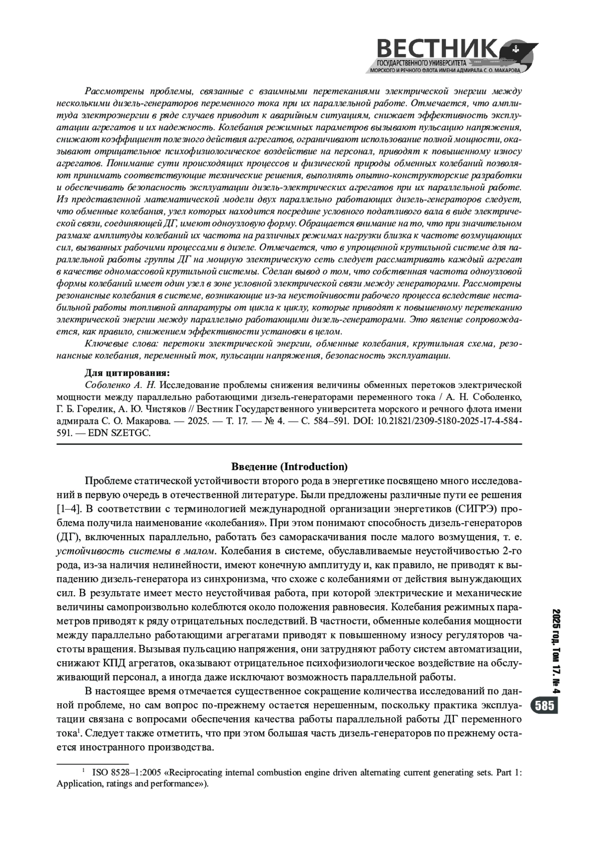 4. Горелик Г. Б. К вопросу о «перетекании» электрической мощности при параллельной работе дизель-генераторов на долевых режимах нагрузки при резонансных колебаниях / Г. Б. Горелик, С. А. Жуков // Актуальные проблемы создания и эксплуатации комбинированных двигателей внутреннего сгорания: материалы международной конференции «Двигатели 2002». - Вып. 2. - Хабаровск: Изд-во Хабар. гос. техн. ун-та, 2002. - С. 140-146.