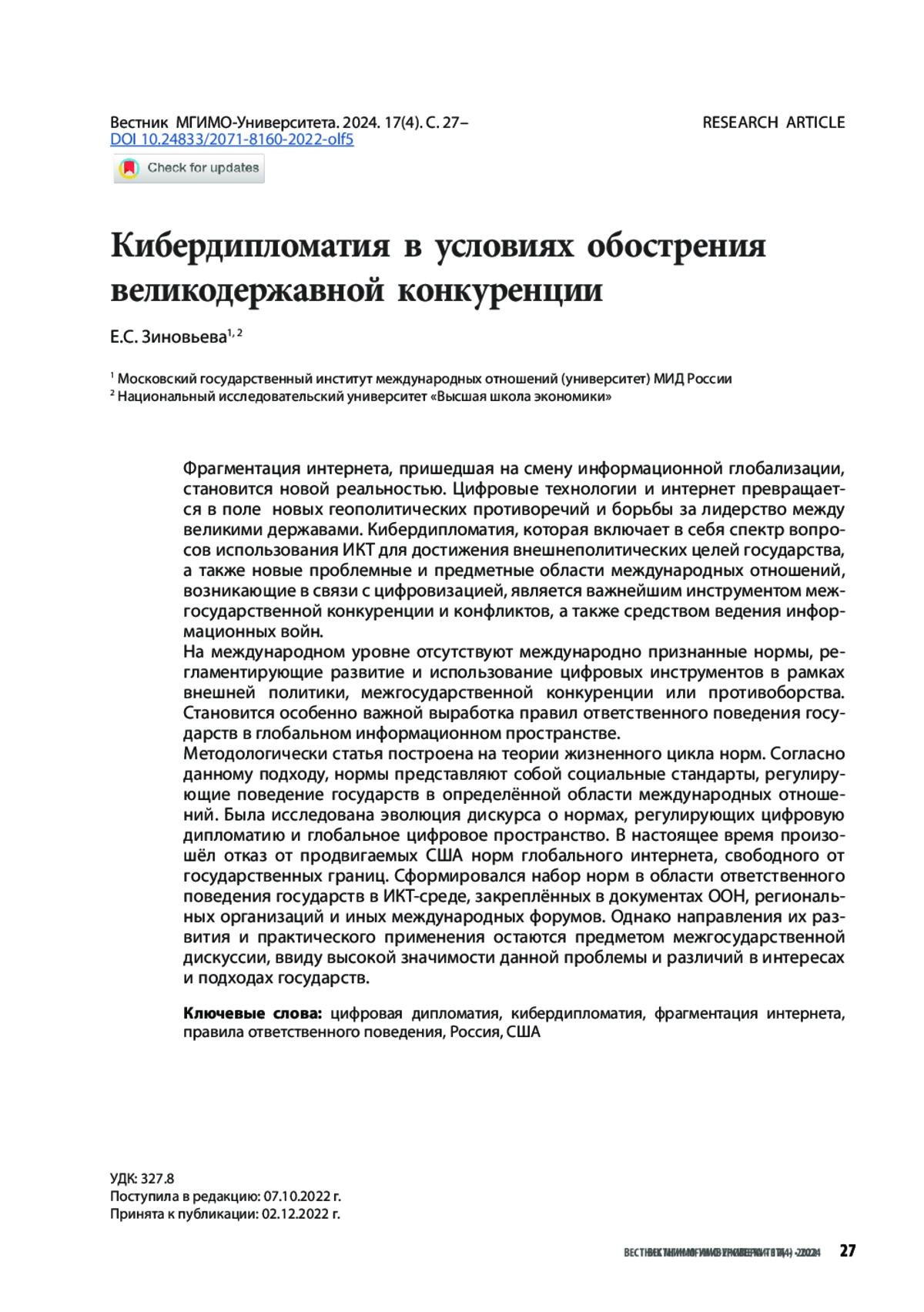 Методологически статья построена на теории жизненного цикла норм. Согласно данному подходу нормы представляют собой социальные стандарты, регулирующие поведение государств в определенной области международных отношений. Была исследована эволюция дискурса о нормах, регулирующих цифровую дипломатию и глобальное цифровое пространство. В настоящее время, произошёл отказ продвигаемых США норм глобального интернета, свободного от государственных границ. Сформировался набор норм в области ответственного поведения государств в ИКТ-среде, закреплённых в документах ООН, региональных организаций и иных международных форумов. Однако, направления их развития и практического применения остаются предметом межгосударственных дискуссии, ввиду высокой значимости данной проблемы и различий в интересах и подходах государств.
