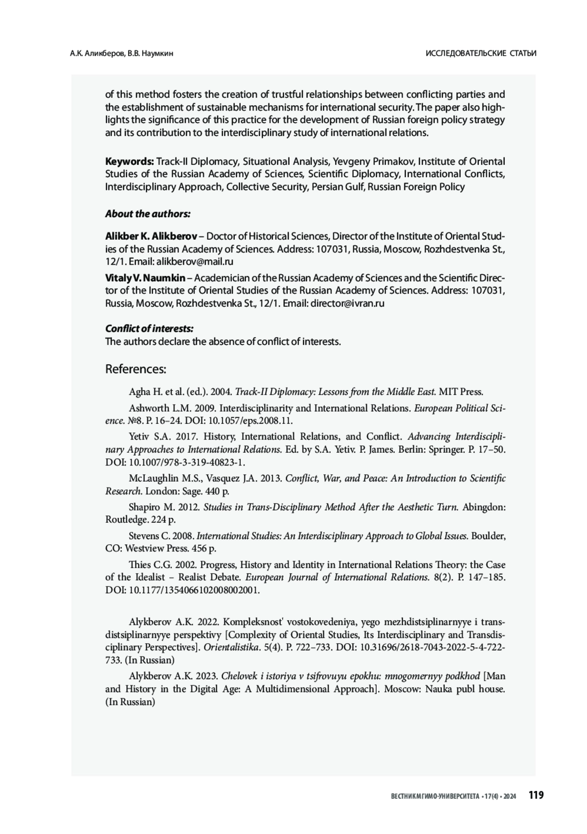 В статье анализируется практика реализации дипломатии второго трека, практикуемая Институтом востоковедения Российской академии наук (ИВ РАН) в форме ситуационного анализа, методология которого была разработана академиком Е. М. Примаковым. Этот подход представляет собой эффективный инструмент урегулирования международных конфликтов и укрепления глобальной безопасности, сочетая науку и дипломатию. Особое внимание уделено серии из трёх экспертных дискуссий по Концепции коллективной безопасности в зоне Персидского залива, проведённых в ИВ РАН в 2019–2023 гг. Эти дискуссии продемонстрировали способность метода объединять широкий круг экспертов для глубокого междисциплинарного анализа сложных международных ситуаций. Практическая направленность результатов ситуационных анализов делает их полезными как для выработки политических рекомендаций, так и для долгосрочного стратегического планирования. Использование этого метода способствует формированию доверительных отношений между конфликтующими сторонами и созданию устойчивых механизмов международной безопасности. Статья также подчёркивает значение данной практики для развития российской внешнеполитической стратегии и её вклад в междисциплинарное изучение международных отношений.
