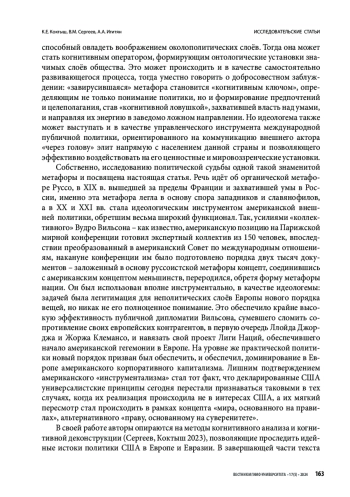 Идейное измерение международных отношений и внешней политики отдельных стран представляет собой самостоятельное поле взаимодействия. Его изучение неизбежно происходит на стыке политической теории и философии. В социально-политической области яркая метафора, которая является базовым инструментом познания, может овладеть умами околополитических слоёв и надолго стать для них «когнитивным ключом», объясняющим политику. Однако она не только может давать необходимое для практических действий понимание контекста и внутренней логики событий, но и может стать своеобразным фильтром при восприятии происходящего, тем самым неявным образом ограничивая свободу воли воспринявшего метафору субъекта. При этом идеализм, постулирующий первичность идей по отношению к материи, подразумевает и возможность преобразования материальной реальности в соответствии с заданными идейными основаниями. Таким образом, метафора может быть сильнейшим инструментом политики. Органическая метафора Руссо, а особенно выстроенные на её основе концептуальные основы политики Вудро Вильсона, рассматриваются в настоящей статье как пример инструментального использования политической метафоры. В исследовании показано, как США использовали метафору для форматирования идейного уровня европейской политики, а сейчас делают это на континентальных пространствах Евразии. В прошлом веке концепт наций позволял расщеплять на неконкурентоспособные части любое конкурирующее образование. Однако борьба с империями, под знаменем которой прошла большая часть прошлого века, отнюдь не закончилась с их фактическим распадом. В современных условиях США, исходя из принципа divide et impera, последовательно противостоят любым интеграционным объединениям, возникающим на пространствах Евразии.