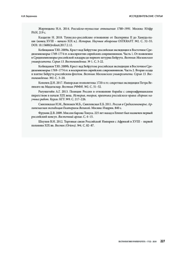 XVIII в. во многих отношениях определил судьбу Российской империи. В стране созревали внутренние предпосылки для модернизации, были достигнуты серьёзные внешнеполитические успехи. Пётр I «прорубил окно» в Европу, а Екатерина II решила задачу открытия для России Чёрного моря. Последнее не только позволило перенести центр земледелия России в южные плодородные земли, но и открыло путь к новым международным морским путям. Геополитические возможности страны заметно расширились. Оказалась «приоткрытой» даже дверь в Африку. До получения выхода в Чёрное и Средиземное моря контактов у России со странами Северной Африки практически не существовало. Именно в екатерининскую эпоху возникла возможность российского взаимодействия с Египтом, Алжиром, Марокко, Тунисом и Триполи. В данной статье исследуются внешнеполитические инициативы России в Северной Африке в царствование Екатерины II. Российская деятельность на этом континенте дополняла усилия на главном для внешней политики Российской империи во второй половине XVIII в. горизонте противоборства с Турцией. Используя сепаратистские движения на окраинах Османской империи, Россия добивалась ослабления и отвлечения сил своего противника во время русско-турецких войн. В мирное время Россия стремилась обеспечить безопасность своих торговых судов. Во второй половине XVIII – начале XIX вв. российская торговля в Средиземном море страдала от нападения корсаров варварийских государств, а именно Туниса, Алжира и Триполи. Для разрешения этой проблемы Россия оказывала давление на Порту, а также пыталась заключить мирные договоры с государствами Северной Африки. Первые шаги России на Африканском континенте были очень скромными, не лишёнными авантюризма, и далеко не все планы удалось реализовать. Статья написана на базе документов из Архива внешней политики Российской империи (АВПРИ) и Российского государственного архива древних актов (РГАДА), которые позволяют понять, как принимались решения и велись переговоры со странами Северной Африки. Некоторые аспекты первых российско-африканских контактов рассматривались в российской и зарубежной исторической литературе, но большее внимание уделялось отдельным сюжетам и странам. В данной статье предпринята попытка всестороннего обозрения причин и содержания внешней политики России XVIII столетия в отношении Северной Африки.