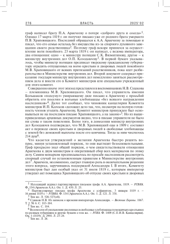 В статье на основе архивных и опубликованных источников рассмотрено участие А. А. Аракчеева в решении дел, касающихся практики освобождения крестьян в вольные хлебопашцы, на примере крестьян тверского помещика М. В. Храповицкого. Автор освещает роль А. А. Аракчеева в решении этого дела, выходящего за рамки основных положений указа 1803 г.