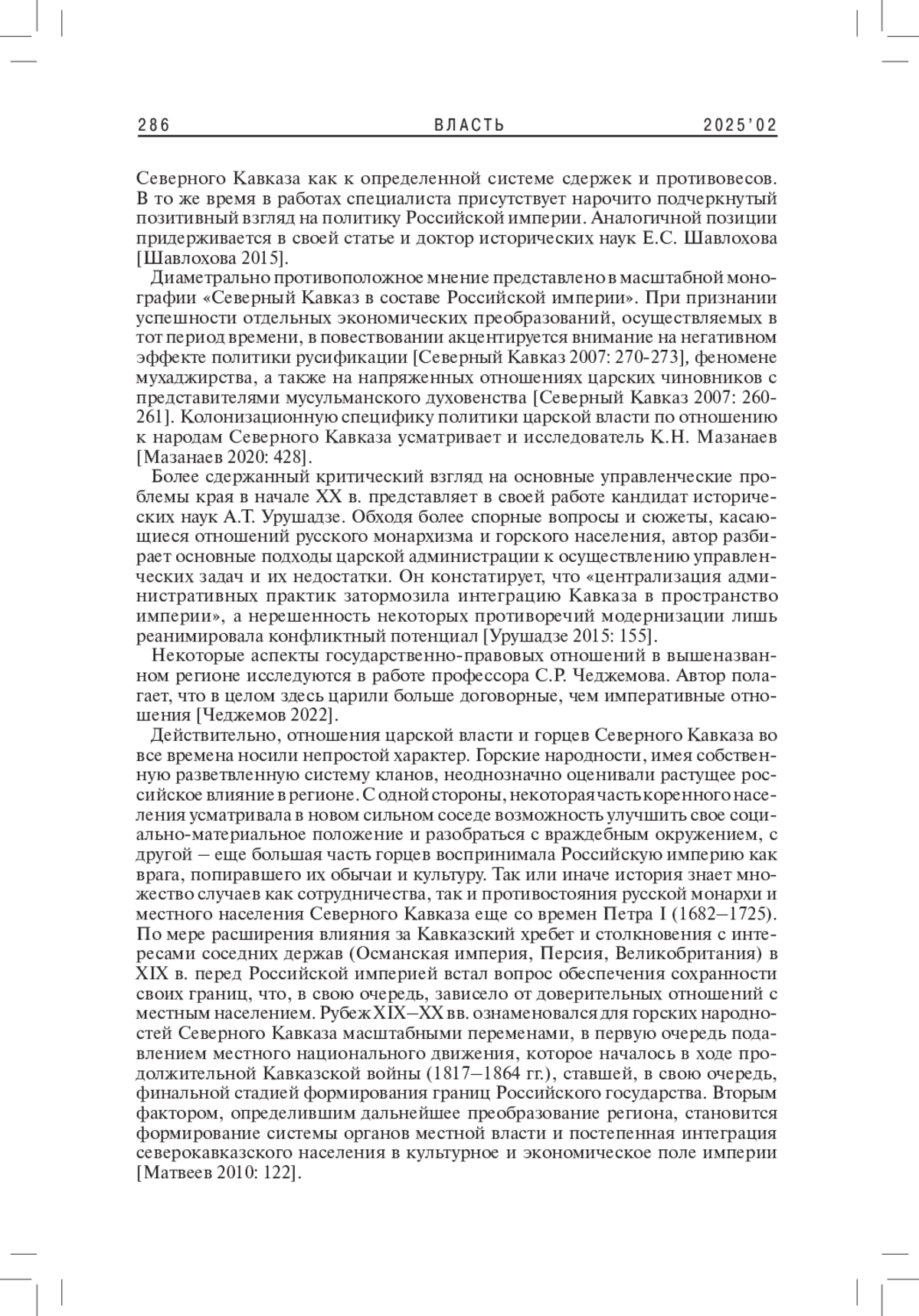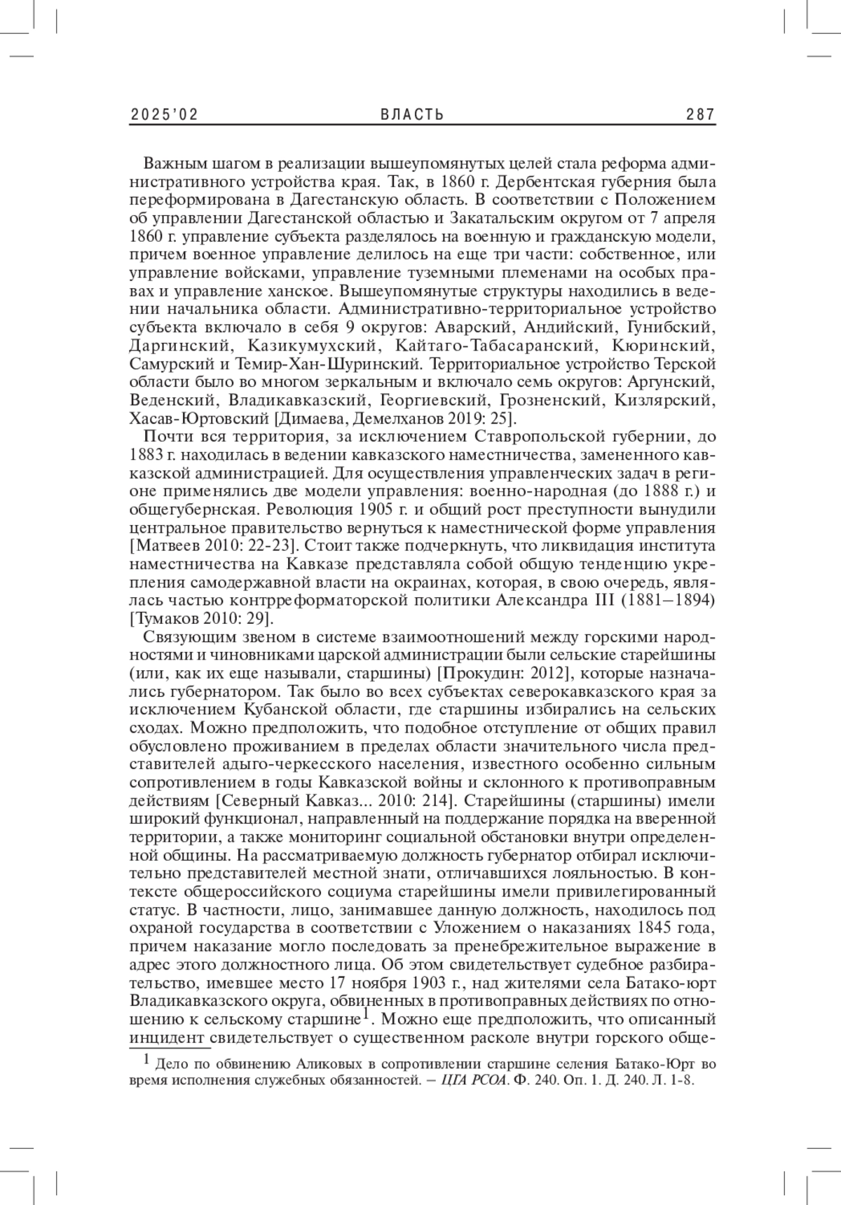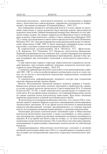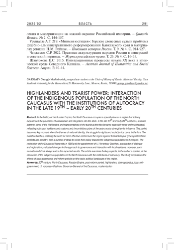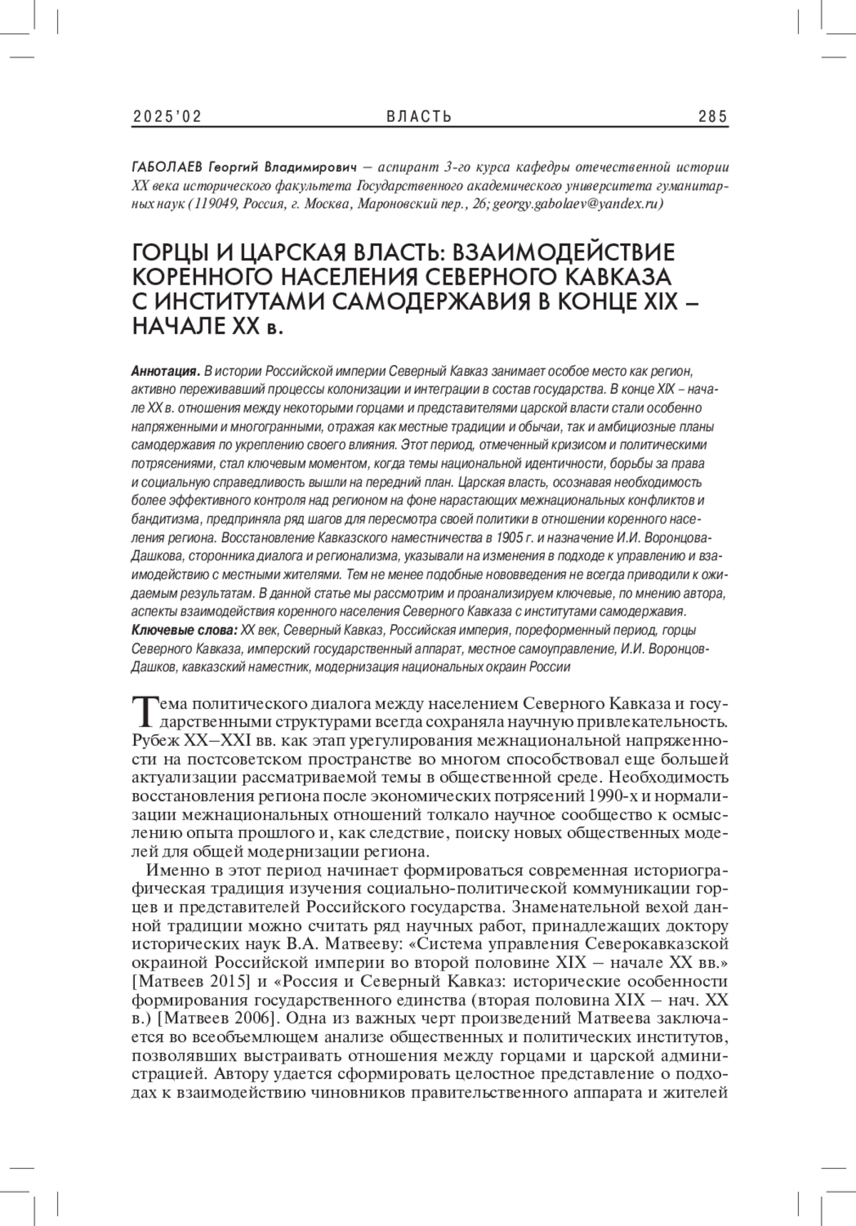 ГАБОЛАЕВ Г. В. ГОРЦЫ И ЦАРСКАЯ ВЛАСТЬ: ВЗАИМОДЕЙСТВИЕ КОРЕННОГО НАСЕЛЕНИЯ СЕВЕРНОГО КАВКАЗА С ИНСТИТУТАМИ САМОДЕРЖАВИЯ В КОНЦЕ XIX - НАЧАЛЕ XX ВВ. // ВЛАСТЬ. 2025. ТОМ 33 № 2
