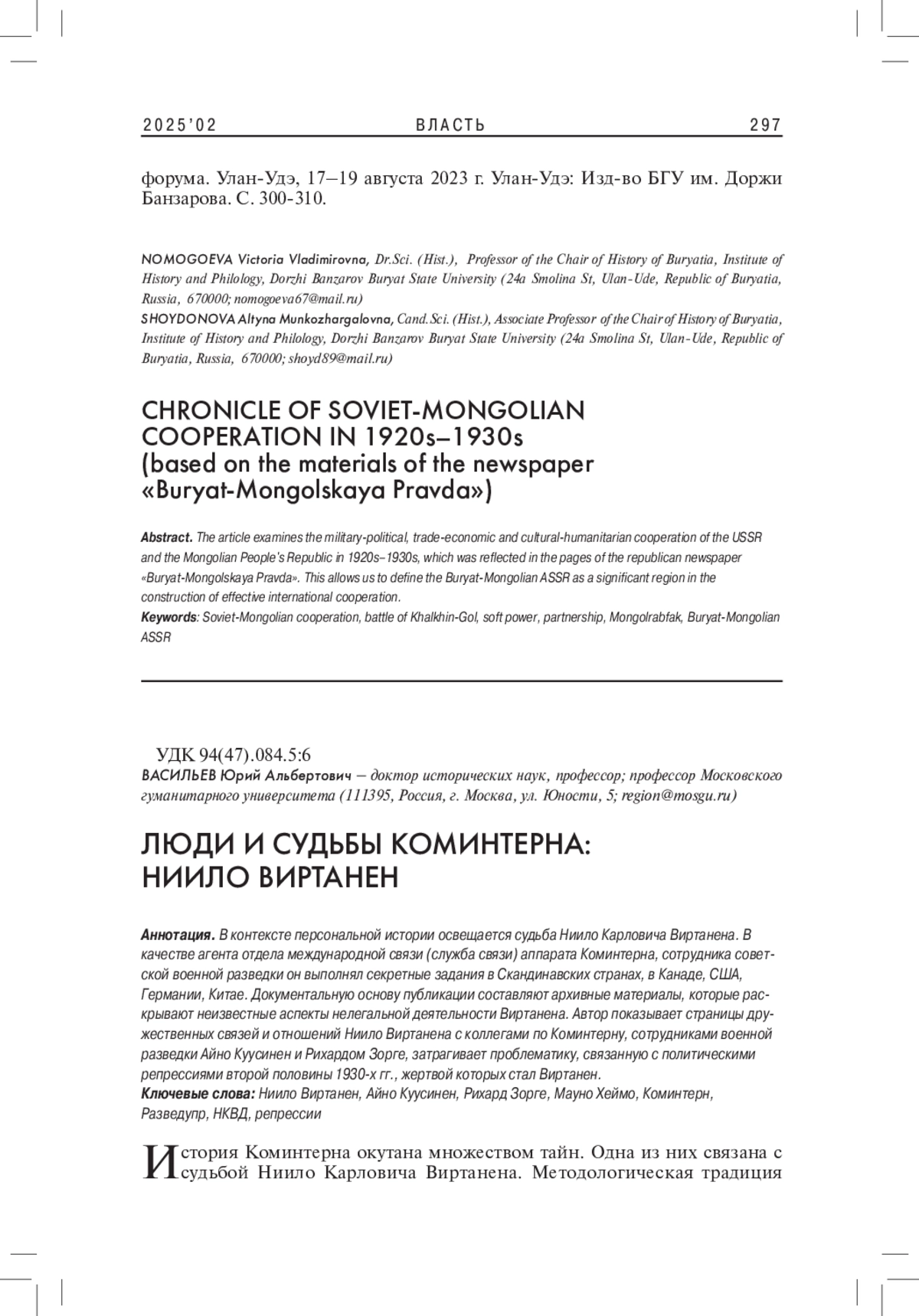 В контексте персональной истории освещается судьба Ниило Карловича Виртанена. В качестве агента отдела международной связи (служба связи) аппарата Коминтерна, сотрудника советской военной разведки он выполнял секретные задания в Скандинавских странах, в Канаде, США, Германии, Китае. Документальную основу публикации составляют архивные материалы, которые раскрывают неизвестные аспекты нелегальной деятельности Виртанена. Автор показывает страницы дружественных связей и отношений Ниило Виртанена с коллегами по Коминтерну, сотрудниками военной разведки Айно Куусинен и Рихардом Зорге, затрагивает проблематику, связанную с политическими репрессиями второй половины 1930-х гг., жертвой которых стал Виртанен.