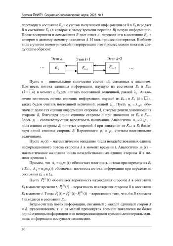 Разработка и внедрение диалоговых систем в социально-экономическую жизнь общества является важной и особенно актуальной проблемой в условиях цифровизации производства продукции и общественных отношений. Для решения данной проблемы разрабатываются различные математические модели диалога. Это прежде всего многоагентные системы, основанные на нейронных сетях, генетических алгоритмах и других методах искусственного интеллекта. Однако результаты работы даже простейших «вопросно-ответных» систем не всегда удовлетворяют пользователей, и для разрешения ситуации приходится привлекать человека-оператора. Одним из направлений повышения эффективности диалоговых систем является применение для их построения совокупности различных математических методов и моделей. Большую эффективность при обработке информации показали методы теории массового обслуживания. Целью данной статьи является моделирование процесса диалога как системы массового обслуживания. Разработана схема диалога индивидуумов (людей или интеллектуальных агентов). Описаны потоки информации между участниками диалога. Эти потоки приняты пуассоновскими. Рассматриваемая система относительно участников диалога описана системой дифференциальных уравнений Колмогорова. Получено решение данной системы, которое можно рассматривать как дифференциальную модель диалога. Рассмотрена формализованная математически модель диалога в установившемся режиме (при достаточно большом времени наблюдений). Этот случай наиболее характерен для анализа текстовых сообщений. Для пояснения разработанного метода рассмотрен числовой пример. Разработанная в статье модель может найти практическое применение для оценки состояний системы диалога, а также в качестве дополнительного инструмента к разрабатываемым диалоговым системам на основе методов искусственного интеллекта.