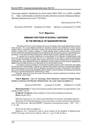 19. Столь, А.В. Оценка качества школьного питания на примере Республики Башкортостан / А.В. Столь // Вестник Пермского национального исследовательского политехнического университета. Социально-экономические науки. - 2024. - № 2. - С. 77-90.