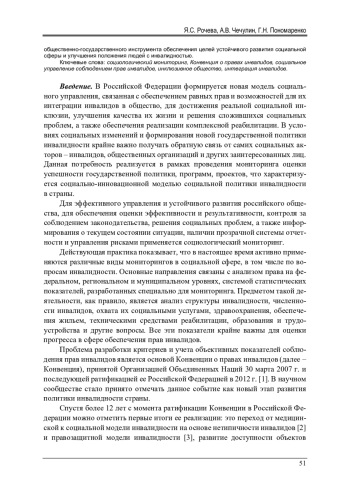Введение. В Российской Федерации формируется новая модель социального управления, связанная с обеспечением равных прав и возможностей для их интеграции инвалидов в общество, для достижения реальной социальной инклюзии, улучшения качества их жизни и решения сложившихся социальных проблем, а также обеспечения реализации комплексной реабилитации. В условиях социальных изменений и формирования новой государственной политики инвалидности крайне важно получать обратную связь от самих социальных акторов – инвалидов, общественных организаций и других заинтересованных лиц. Данная потребность реализуется в рамках проведения мониторинга оценки успешности государственной политики, программ, проектов, что характеризуется социально-инновационной моделью социальной политики инвалидности в страны
