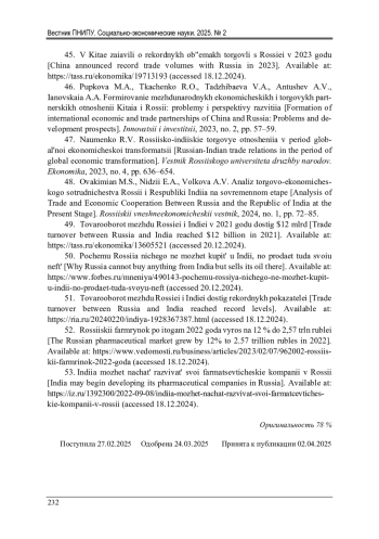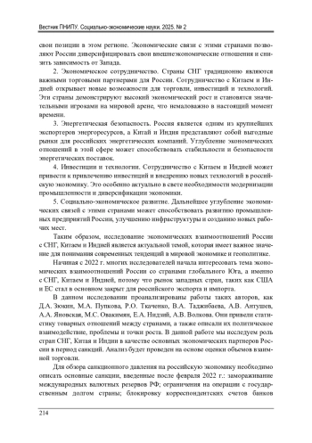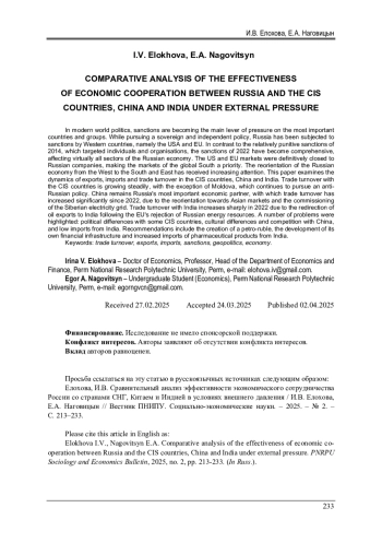ЕЛОХОВА И. В., НАГОВИЦЫН Е. А. СРАВНИТЕЛЬНЫЙ АНАЛИЗ ЭФФЕКТИВНОСТИ ЭКОНОМИЧЕСКОГО СОТРУДНИЧЕСТВА РОССИИ СО СТРАНАМИ СНГ, КИТАЕМ И ИНДИЕЙ В УСЛОВИЯХ ВНЕШНЕГО ДАВЛЕНИЯ // ВЕСТНИК ПЕРМСКОГО НАЦИОНАЛЬНОГО ИССЛЕДОВАТЕЛЬСКОГО ПОЛИТЕХНИЧЕСКОГО УНИВЕРСИТЕТА. СОЦИАЛЬНО-ЭКОНОМИЧЕСКИЕ НАУКИ. 2025. № 2