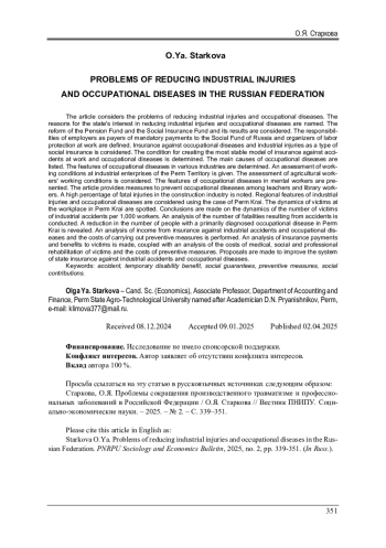 Рассмотрены проблемы сокращения травматизма на производстве и заболеваний, связанных с профессиональной деятельностью. Названы причины заинтересованности государства в сокращении травм и заболеваний на производстве. Рассмотрено реформирование деятельности Пенсионного фонда и фонда социального страхования и его результаты. Определены обязанности работодателей как плательщиков обязательных платежей в Социальный фонд России и организаторов охраны труда на производстве. Названы основные причины заболеваний, вызванных профессиональной деятельностью. Определены особенности заболеваний в различных отраслях промышленности. Дана оценка условий труда на промышленных предприятиях Пермского края, а также условий труда работников сельского хозяйства. Определены особенности заболеваний у работников умственного труда. Отмечен высокий процент травм в строительной отрасли со смертельным исходом. Рассмотрены региональные особенности травм на производстве и заболеваний на примере Пермского края. Определена динамика пострадавших на рабочем месте в Пермском крае. Сделаны выводы по динамике числа пострадавших от несчастного случая на производстве в расчете на 1000 работающих. Проведен анализ количества смертей в результате несчастного случая. Выявлено сокращение количества работников со впервые установленным заболеванием в Пермском крае. Проведен анализ доходов страхования и расходов на проведение предупредительных мер, анализ страховых выплат и пособий пострадавшим, расходов на медицинскую, социальную и профессиональную реабилитацию пострадавших, а также на предупредительные мероприятия. Сделаны предложения по совершенствованию системы государственного страхования работающих граждан.