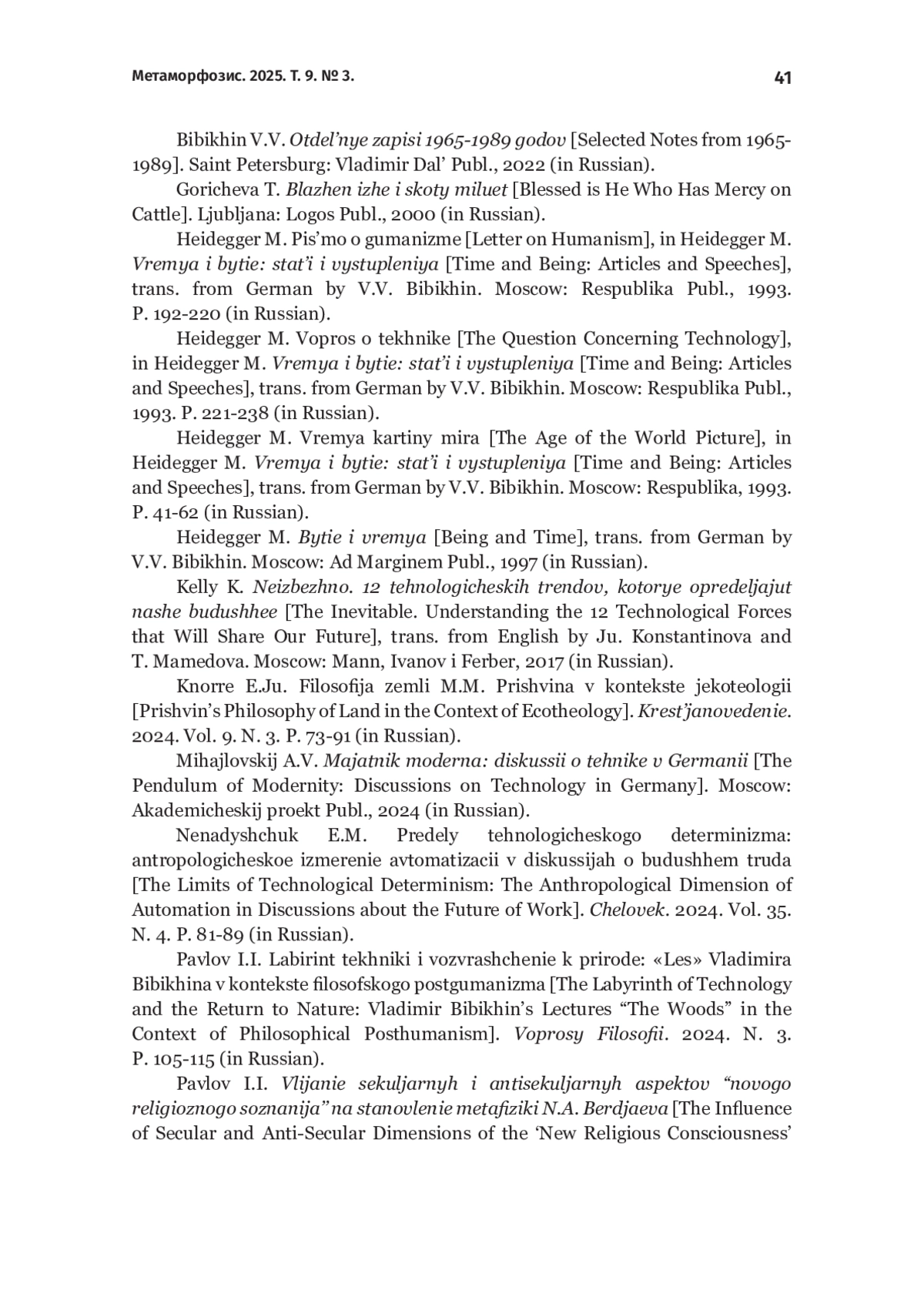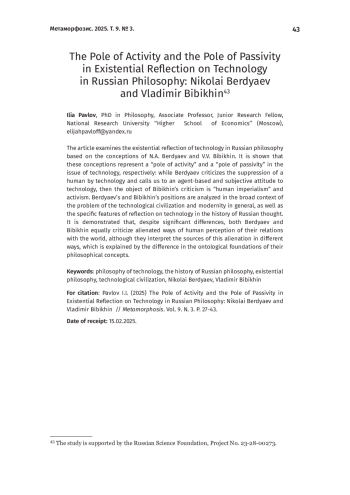 ПАВЛОВ И. ПОЛЮС АКТИВНОСТИ И ПОЛЮС ПАССИВНОСТИ В ЭКЗИСТЕНЦИАЛЬНОЙ РЕФЛЕКСИИ О ТЕХНИКЕ В РУССКОЙ ФИЛОСОФИИ: НИКОЛАЙ БЕРДЯЕВ И ВЛАДИМИР БИБИХИН // МЕТАМОРФОЗИС. 2025. ТОМ 9, № 3