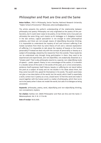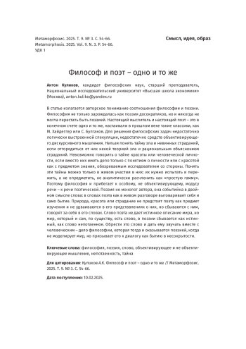 В статье излагается авторское понимание соотношения философии и поэзии. Философия не только зарождалась как поэзия досократиков, но и никогда не могла перестать быть поэзией. Настоящий мыслитель и настоящий поэт – это в конечном счете одно и то же, настаивали в прошлом веке такие классики, как М. Хайдеггер или С. Булгаков. Для решения философских задач недостаточно логически выстроенной спекуляции, недостаточно средств объективирующего дискурсивного мышления. Нельзя понять тайну зла и невинных страданий, если отгородиться от них некой теорией зла и рациональным объяснением страданий. Невозможно говорить о тайне красоты или человеческой личности, если вместо них иметь дело только с понятием о личности или с красотой как с предметом знания, обозреваемым исследователем со стороны. Понять эти тайны можно только в живом участии в них: их нужно испытать и пережить, а не опредметить, не аналитически расчленить как «простую гамму». Поэтому философия и прибегает к особому, не объективирующему, модусу речи – к речи поэтической. Поэзия не монолог автора, она событийна в двойном смысле слова: в словах поэта как в живом разговоре выговаривает себя и само бытие. Природа, красота или страдание не предстоят поэту как предмет изучения и не удваиваются в его представлениях о них, но сбываются с ним, говорят за себя в его словах. Слово поэта не дает истинное описание мира, но мир, который и сам, по существу, есть слово, в поэзии сбывается как истинный, как слово непотаенное. Обрести это слово и дать ему звучать вместе с человеческим – дело философии, которая тогда и оказывается поэзией, когда не моделирует мир, но призывает его к диалогу как бытию в несокрытости.