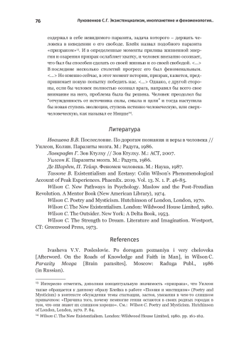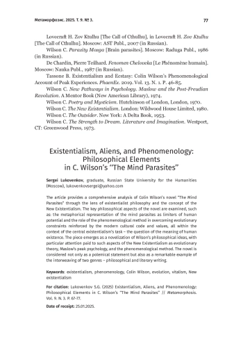 ЛУКОВЕНКОВ С. ЭКЗИСТЕНЦИАЛИЗМ, ИНОПЛАНЕТЯНЕ И ФЕНОМЕНОЛОГИЯ: ФИЛОСОФСКИЕ ЛИНИИ В РОМАНЕ К. УИЛСОНА «ПАРАЗИТЫ СОЗНАНИЯ» // МЕТАМОРФОЗИС. 2025. ТОМ 9, № 3