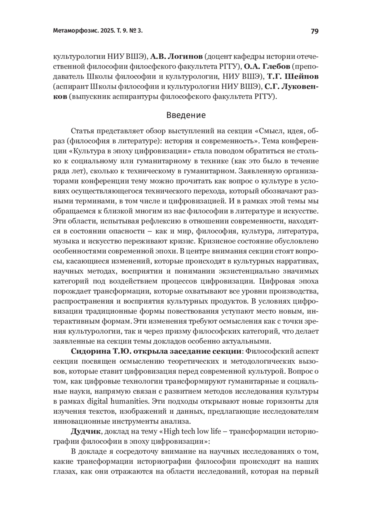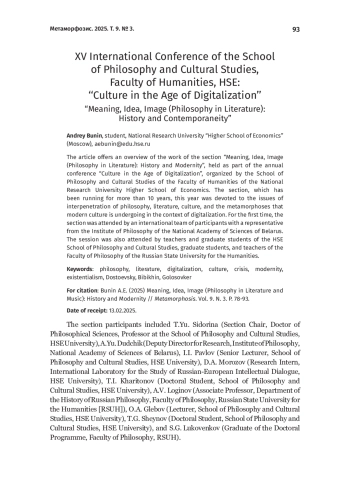 Вниманию читателя предлагается обзор работы секции «Смысл, идея, образ (философия в литературе): история и современность», прошедшей в рамках ежегодной конференции «Культура в эпоху цифровизации», организованной Школой философии и культурологии факультета гуманитарных наук НИУ ВШЭ. Секция, проходящая уже более 10 лет, в этом году была посвящена вопросам взаимопроникновения философии, литературы, культуры и метаморфозам, которые претерпевает современная культура в условиях цифровизации. Впервые в рамках секции присутствовал международный состав участников с представителем из Института философии Национальной академии наук Беларуси. В сессии также принимали участие преподаватели и аспиранты Школы философии и культурологии НИУ ВШЭ, аспиранты и преподаватели философского факультета РГГУ.
