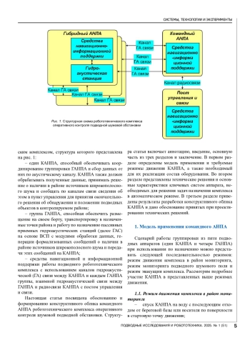 В статье предложен и обоснован конструктивный облик командного автономного необитаемого подводного аппарата (КАНПА) робототехнического комплекса гибридных автономных необитаемых подводных аппаратов (ГАНПА), оборудованных векторно-скалярными приемниками (ВСП) звука для решения задач оперативного мониторинга подводной шумовой обстановки в заданной акватории. КАНПА должен обеспечивать координированное управление движением группы ГАНПА в заданный район и обратно, расстановку аппаратов в заданные географические координаты донной поверхности для образования распределенной антенной системы ВСП, а также сбор результатов обработки сигналов шумового звукового поля по гидроакустическому каналу связи и передачу их на удаленный пост управления в реальном времени по радиоканалу. Предложена модель применения КАНПА, определен состав оборудования, обеспечивающий его целевое использование, обоснован и сформирован конструктивный облик аппарата. При этом особое внимание было уделено унификации бортовых систем комплекса КАНПА и ГАНПА. Отмечены перспективы применения такого комплекса, определяющие возможность решения задач назначения в реальном времени и повышение эффективности его использования.