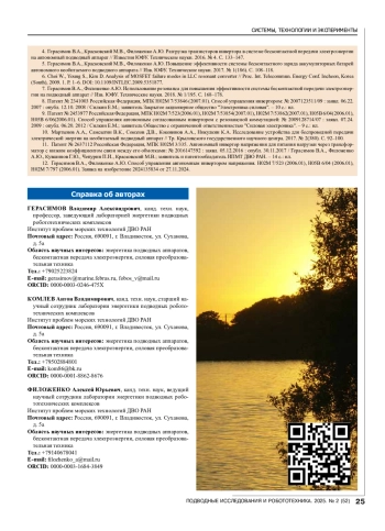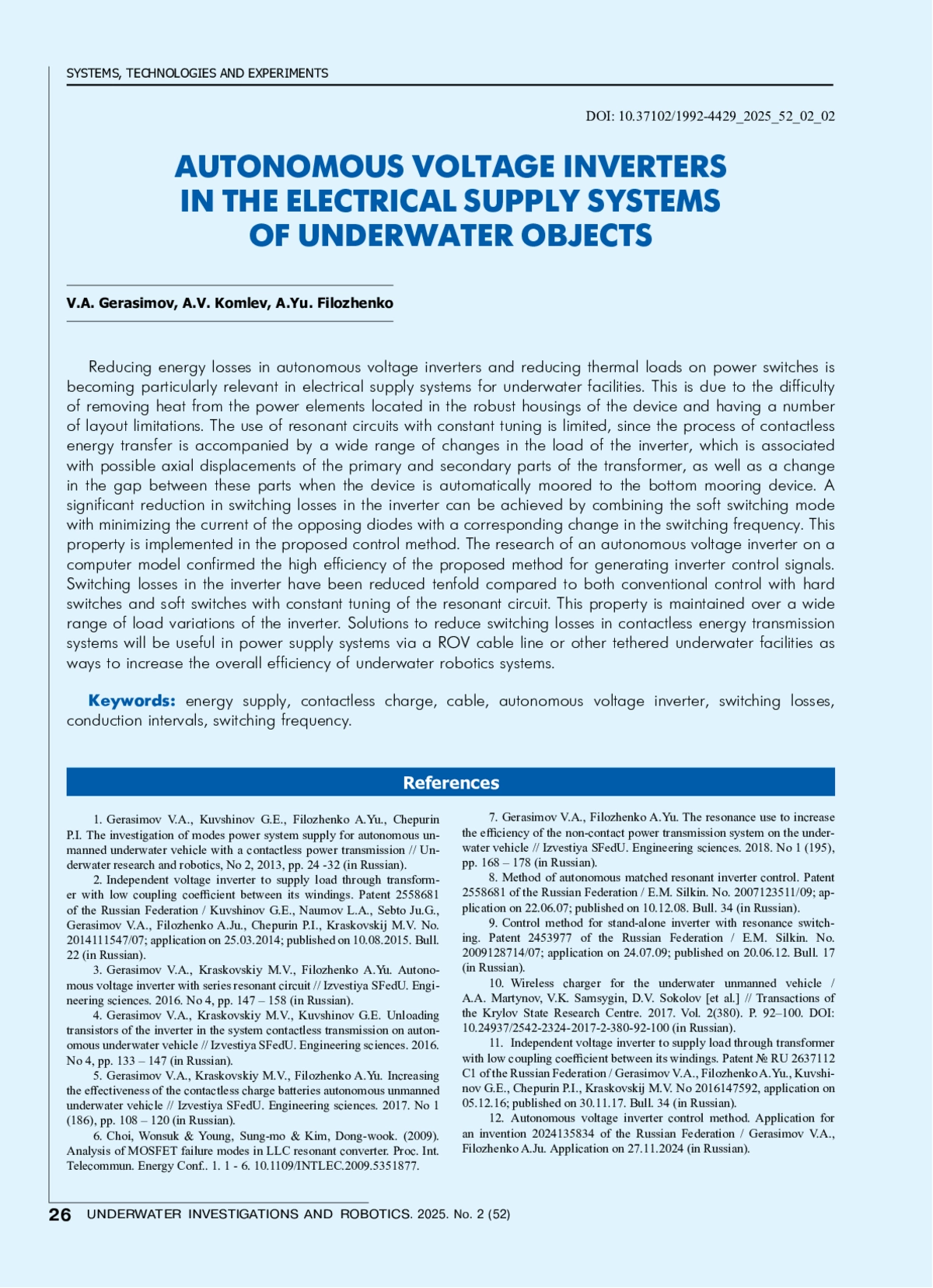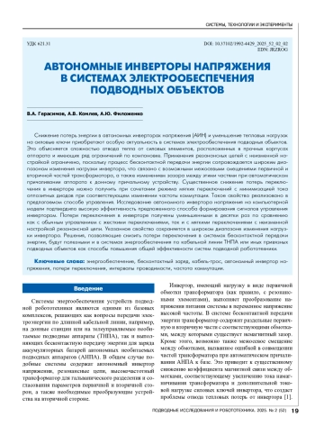 ГЕРАСИМОВ В. А., КОМЛЕВ А. В., ФИЛОЖЕНКО А. Ю. АВТОНОМНЫЕ ИНВЕРТОРЫ НАПРЯЖЕНИЯ В СИСТЕМАХ ЭЛЕКТРООБЕСПЕЧЕНИЯ ПОДВОДНЫХ ОБЪЕКТОВ // ПОДВОДНЫЕ ИССЛЕДОВАНИЯ И РОБОТОТЕХНИКА. 2025. № 2 (52)