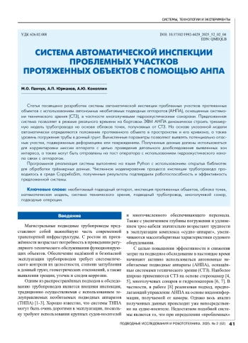 Статья посвящена разработке системы автоматической инспекции проблемных участков протяженных объектов с использованием автономных необитаемых подводных аппаратов (АНПА), оснащенных системами технического зрения (СТЗ), в частности многолучевыми гидроакустическими сонарами. Предложенная система позволяет в режиме реального времени на бортовом ЭВМ АНПА динамически строить трехмерную модель трубопровода на основе облаков точек, получаемых от СТЗ. На основе указанной модели автоматически определяются положение протяженного объекта в пространстве и его кривизна, а также уровень погружения трубы в донный грунт. Вычисленные параметры позволяют выявлять потенциально опасные участки, подверженные деформациям или повреждениям. Полученные данные должны использоваться для корректировки миссии аппарата с целью проведения детального дообследования выявленных зон интереса, а также могут быть отправлены на пост оператора с использованием гидроакустического канала связи с аппаратом.