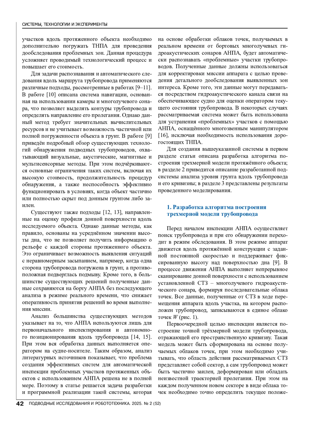 Магистральные подводные трубопроводы представляют собой важнейшую часть современной транспортной инфраструктуры. С ростом их протяжённости возрастает потребность в проведении регулярного технического обслуживания функционирующих объектов. Обеспечение надёжной и безопасной эксплуатации трубопроводов требует систематического контроля их целостности, степени заглубления в донный грунт, геометрических отклонений, а также выявления трещин, утечек и следов коррозии.