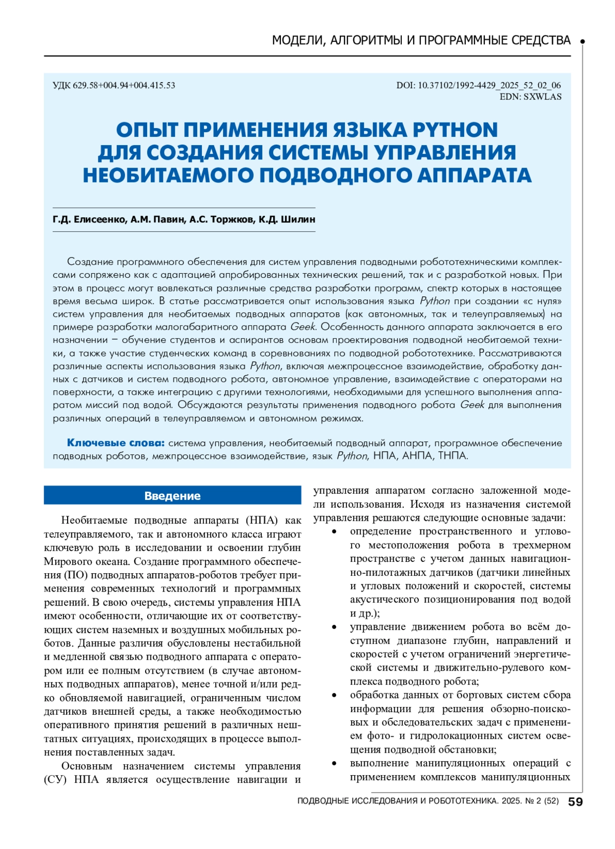 Создание программного обеспечения для систем управления подводными робототехническими комплексами сопряжено как с адаптацией апробированных технических решений, так и с разработкой новых. При этом в процесс могут вовлекаться различные средства разработки программ, спектр которых в настоящее время весьма широк. В статье рассматривается опыт использования языка Python при создании «с нуля» систем управления для необитаемых подводных аппаратов (как автономных, так и телеуправляемых) на примере разработки малогабаритного аппарата Geek. Особенность данного аппарата заключается в его назначении – обучение студентов и аспирантов основам проектирования подводной необитаемой техники, а также участие студенческих команд в соревнованиях по подводной робототехнике. Рассматриваются различные аспекты использования языка Python, включая межпроцессное взаимодействие, обработку данных с датчиков и систем подводного робота, автономное управление, взаимодействие с операторами на поверхности, а также интеграцию с другими технологиями, необходимыми для успешного выполнения аппаратом миссий под водой. Обсуждаются результаты применения подводного робота Geek для выполнения различных операций в телеуправляемом и автономном режимах.