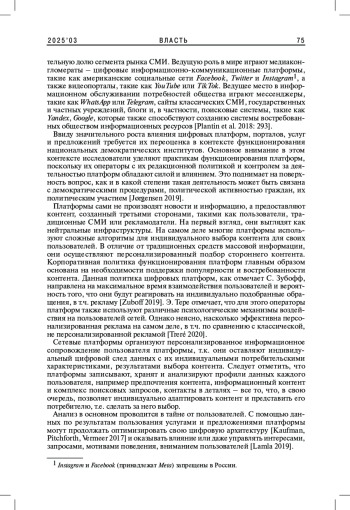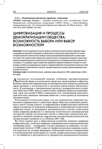 В статье предпринята попытка провести комплексный анализ влияния цифровой среды, платформенных решений и алгоритмов на общественно-политическую сферу общества. На основе интерпретационного анализа автор проводит оценку функционирования демократии в самом широком смысле. На основе анализа результатов социологического исследования в ведущих странах мира выявлена неудовлетворенность работой институтов демократии. Исследование автора позволяет констатировать, что цифровая среда, воздействие зарубежных медиаконгломератов способны не только оказывать влияние на индивидуальные запросы и медиапотребление пользователей социальных сетей, но и формировать общественные установки, оказывать давление на процесс функционирования политических институтов.