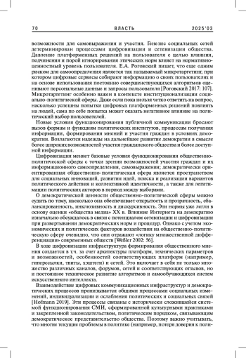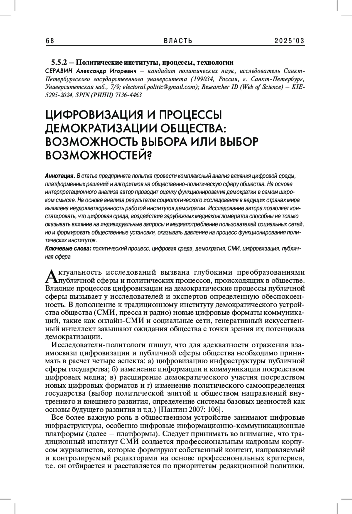 Актуальность исследований вызвана глубокими преобразованиями публичной сферы и политических процессов, происходящих в обществе. Влияние процессов цифровизации на демократические процессы публичной сферы вызывает у исследователей и экспертов определенную обеспокоенность.
