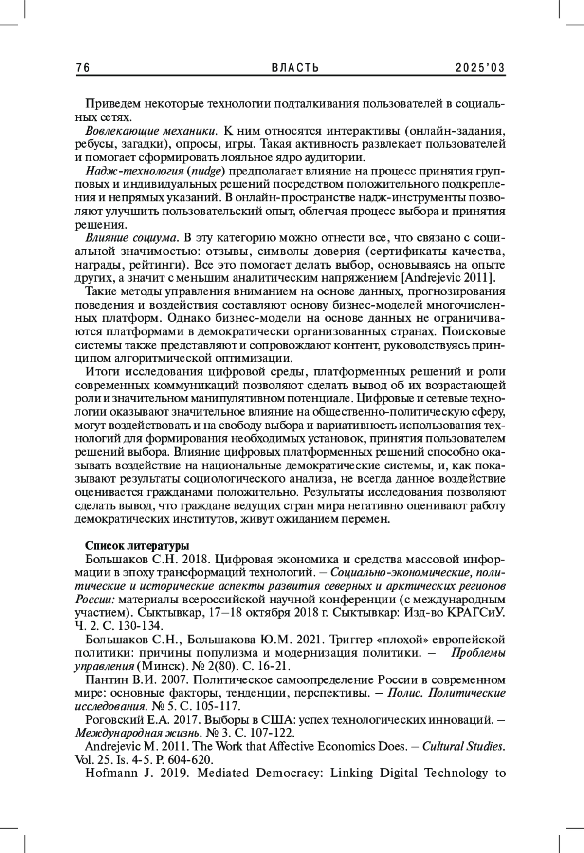 2. Большаков С.Н., Большакова Ю.М. 2021. Триггер “плохой” европейской политики: причины популизма и модернизация политики. - Проблемы управления (Минск). № 2(80). С. 16-21. EDN: QJGAKP