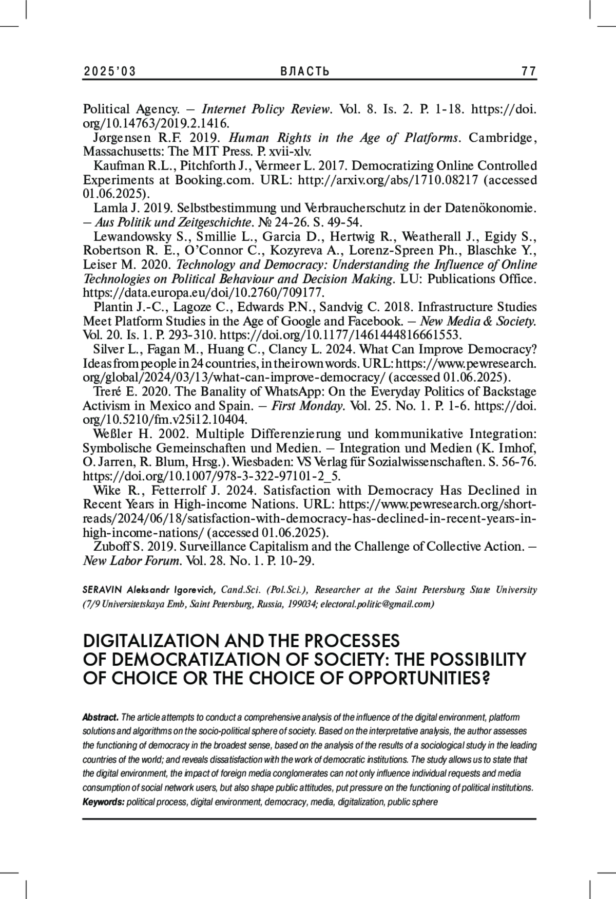 6. Hofmann J. 2019. Mediated Democracy: Linking Digital Technology to Political Agency. - Internet Policy Review. Vol. 8. Is. 2. Р. 1-18. DOI: 10.14763/2019.2.1416