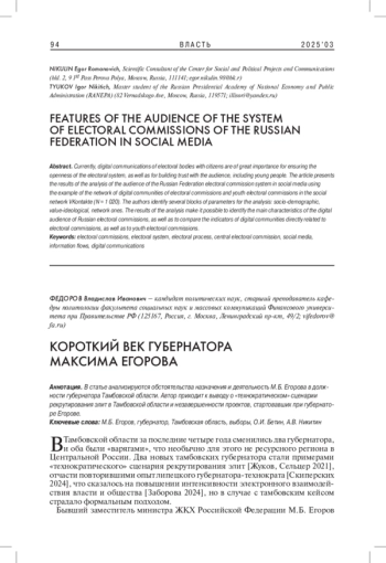 В настоящее время цифровые коммуникации избирательных органов с гражданами имеют большое значение для обеспечения открытости электоральной системы, а также формирования доверия со стороны аудитории, в т. ч. молодежи. В статье представлены результаты анализа аудитории системы избирательных комиссий Российской Федерации в социальных медиа на примере сети цифровых сообществ избирательных комиссий и молодежных избирательных комиссий в социальной сети ВКонтакте (N = 1 020). Авторы выделили несколько блоков параметров для проведения анализа: социально-демографический, ценностно-идеологический, сетевой. Результаты анализа позволили выделить основные характеристики цифровой аудитории российских избиркомов, а также провести сопоставление между показателями цифровых сообществ, относящихся непосредственно к избирательным комиссиям, а также к молодежным избирательным комиссиям.