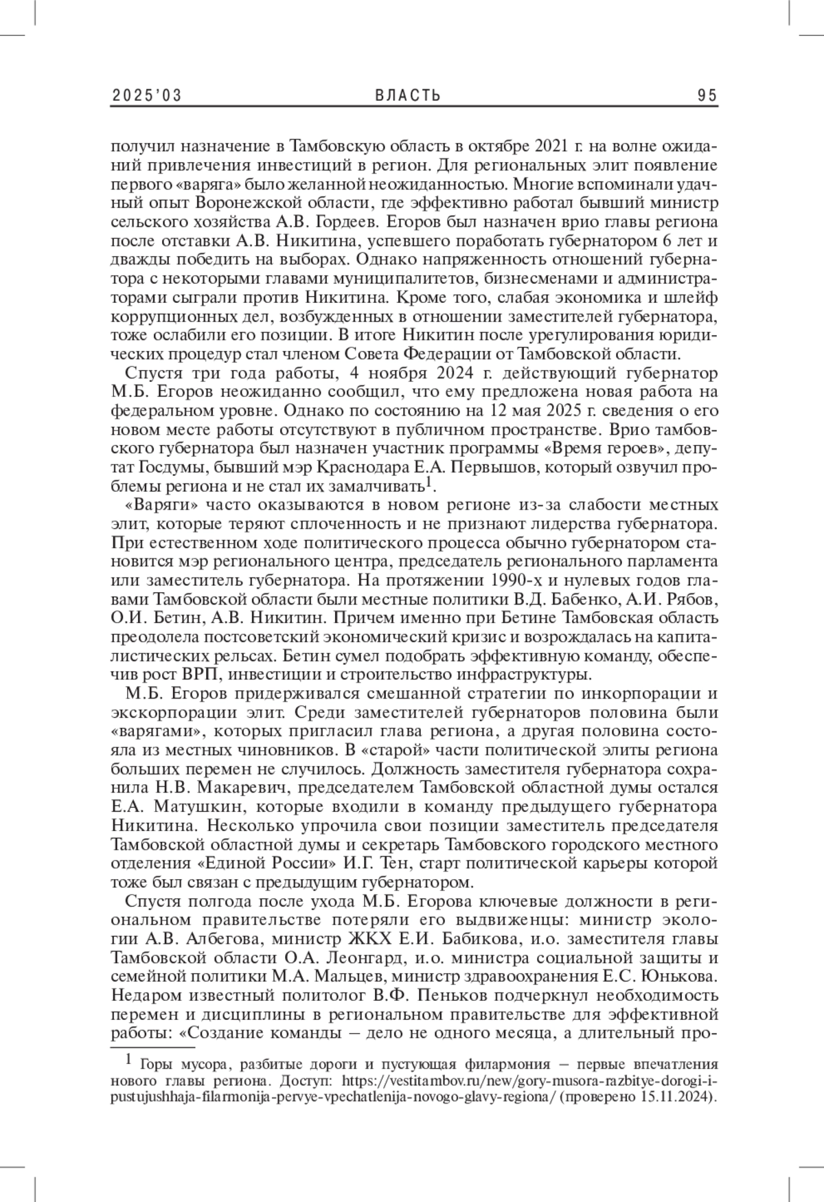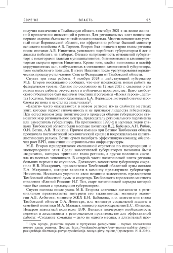В статье анализируются обстоятельства назначения и деятельность М. Б. Егорова в должности губернатора Тамбовской области. Автор приходит к выводу о «технократическом» сценарии рекрутирования элит в Тамбовской области и незавершенности проектов, стартовавших при губернаторе Егорове.