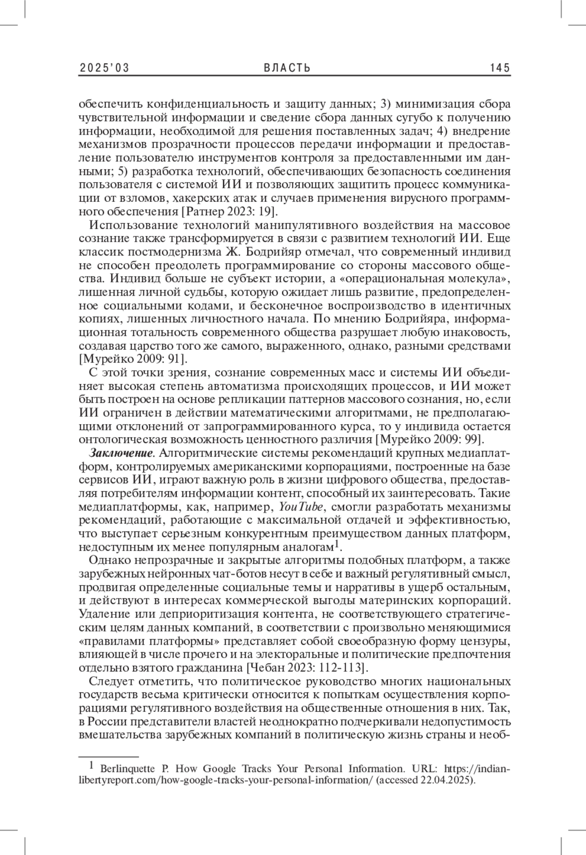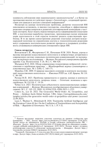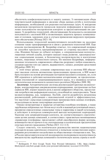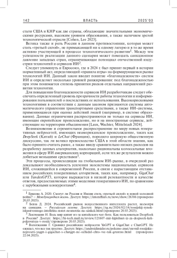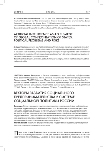 БОЧАНОВ М. А., СИТДИКОВ Ф. А. ИСКУССТВЕННЫЙ ИНТЕЛЛЕКТ КАК ЭЛЕМЕНТ ГЛОБАЛЬНОГО ПРОТИВОСТОЯНИЯ ГОСУДАРСТВ: ПОЛИТИЧЕСКИЕ ПРОБЛЕМЫ И РИСКИ // ВЛАСТЬ. 2025. ТОМ 33 № 3