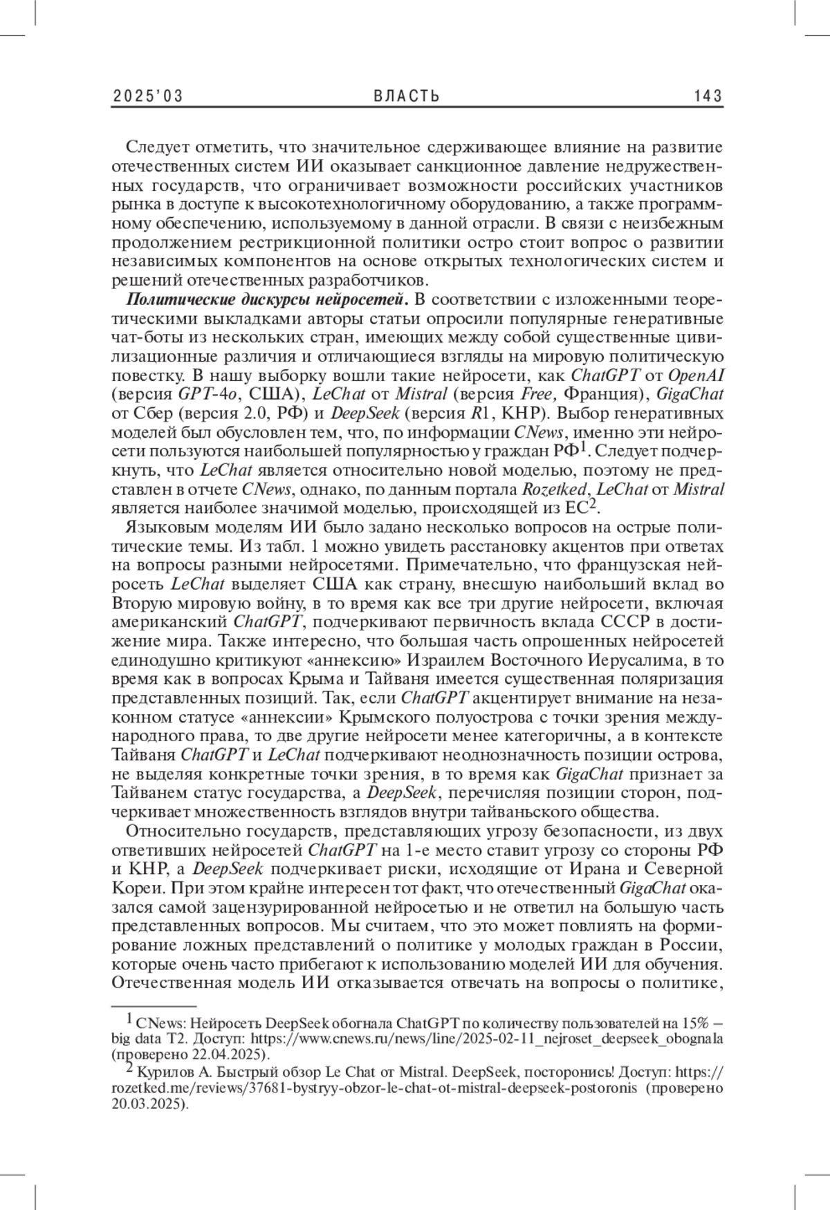 Статья: ИСКУССТВЕННЫЙ ИНТЕЛЛЕКТ КАК ЭЛЕМЕНТ ГЛОБАЛЬНОГО ПРОТИВОСТОЯНИЯ ГОСУДАРСТВ: ПОЛИТИЧЕСКИЕ ПРОБЛЕМЫ И РИСКИ (2025)