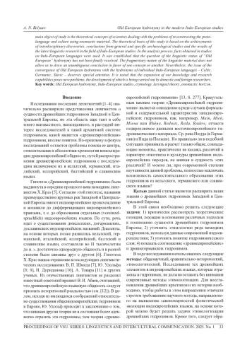 Предметом исследования в настоящей статье являются названия крупных рек в Западной и Центральной Европе. В этом контексте прежде всего упоминается Х. Краэ, который в 1950-х гг. прошлого столетия создал теорию «Древнеевропейская гидронимия». В статье критически рассматривается теоретическая концепция Х. Краэ, изложенная в ряде его трудов и явившаяся базой для лингвистической интерпретации «древнеевропейской» гидронимии. Критически рассматриваются также некоторые работы его учеников и единомышленников. Отмечается, что объективная необходимость в освещении теоретических оснований «древнеевропейской» гидронимии созрела давно. Прежде всего это касается этимологии некоторых названий рек. Обращается внимание на общетеоретические положения современной индоевропеистики, образующие единую концепцию реконструкции праязыковой ситуации в Западной и Центральной Европе. Главным объектом изучения являются теоретические концепции ученых, занимающихся проблемами реконструкции праязыка и культуры с использованием ономастического материала. Теоретическую основу настоящего исследования составляют использование достижений, связанных с междисциплинарными открытиями, выводы из общих и частных археологических исследований и результаты новейших лингвистических исследований в области индоевропеистики. В процессе анализа использовались факты, полученные в исследованиях по индоевропейским языкам. В результате проведенного анализа установлено, что вопрос о лингвистическом статусе «древнеевропейской» гидронимии окончательно не решен. Фрагментарность языкового материала не позволяет сделать однозначный вывод в пользу той или иной концепции. Тем не менее заслуживает особого внимания вопрос сближения древнеевропейских гидронимов с гидронимами отдельных индоевропейских языков - кельтским, германским, славянским. Отмечается, что расширение наших знаний и исследовательских возможностей ставит новые проблемы, разработка которых ведется отечественными и зарубежными исследователями.