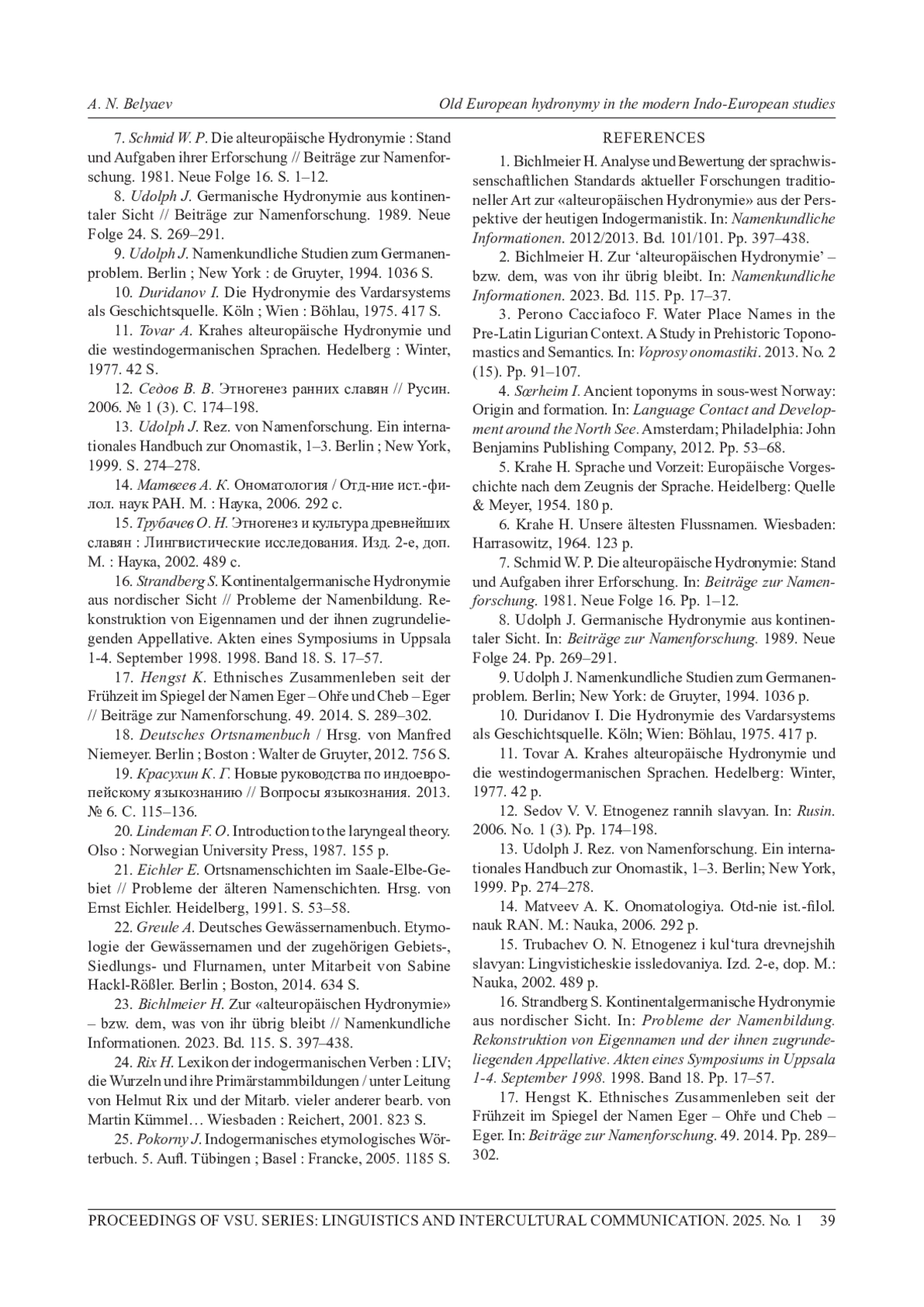 1. Bichlmeier Н. Analyse und Bewertung der sprachwissenschaftlichen Standards aktueller Forschungen traditioneller Art zur “alteuropaischen Hydronymie” aus der Perspektive der heutigen Indogermanistik // Namenkundliche Informationen. 2012/2013. Bd. 101/101. S. 397-438.