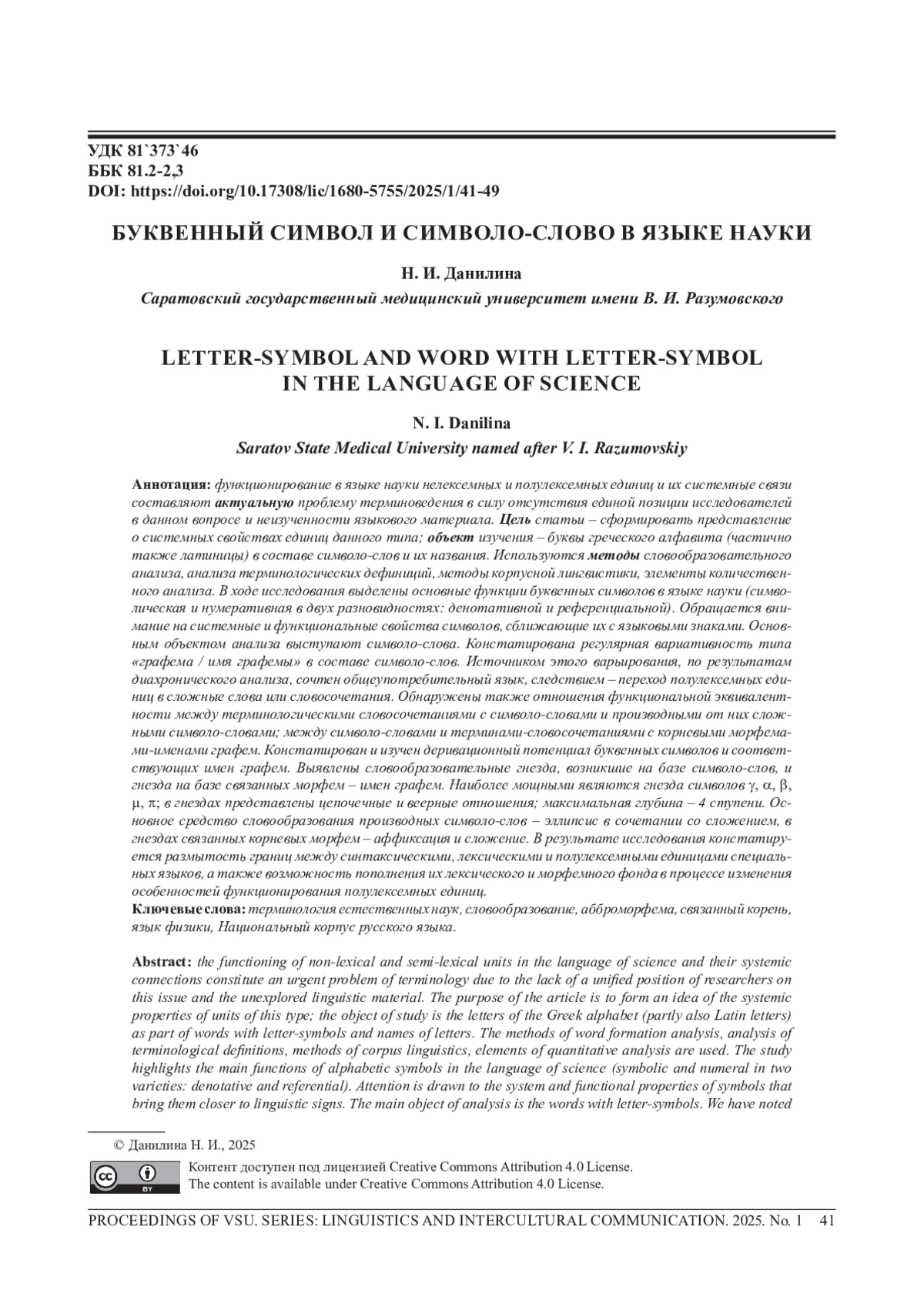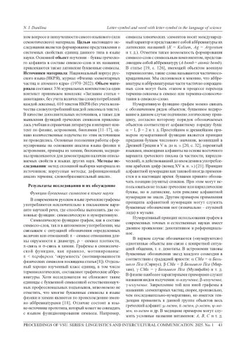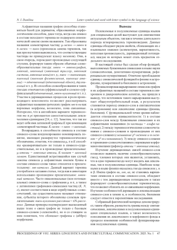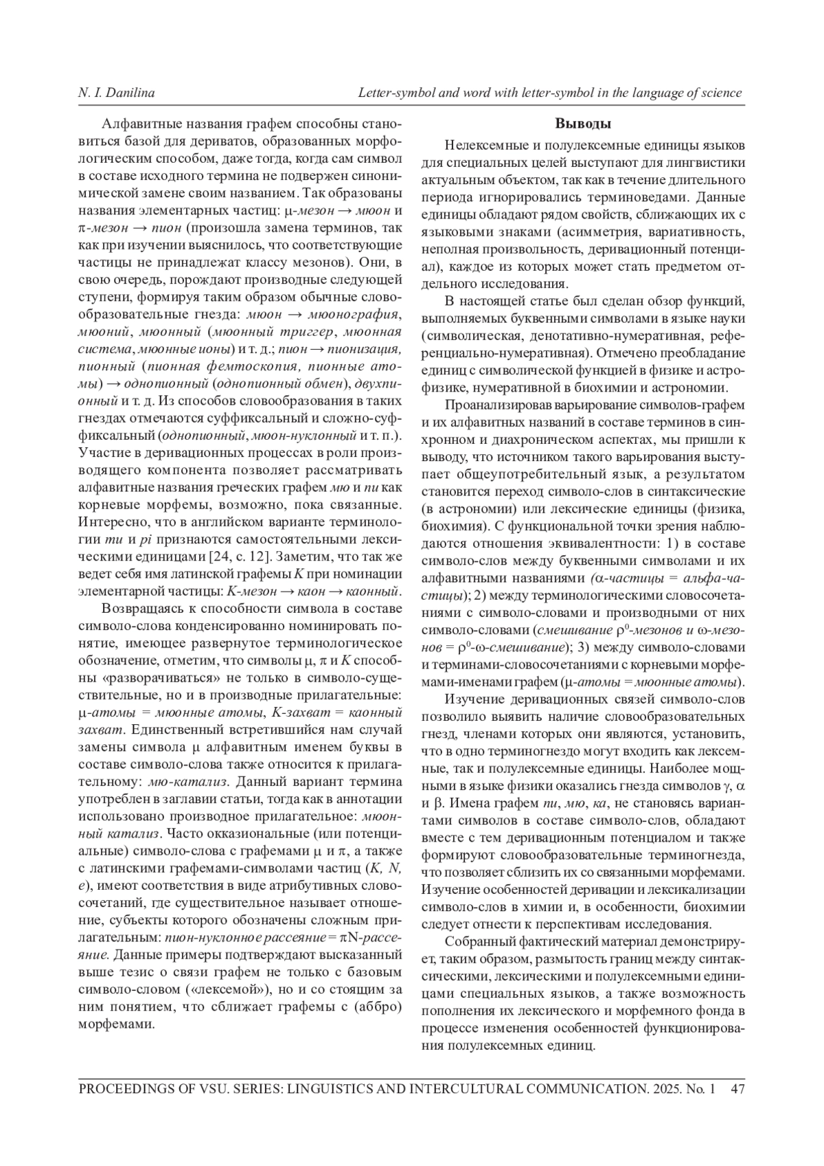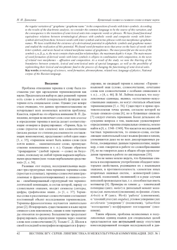 Функционирование в языке науки нелексемных и полулексемных единиц и их системные связи составляют актуальную проблему терминоведения в силу отсутствия единой позиции исследователей в данном вопросе и неизученности языкового материала. Цель статьи - сформировать представление о системных свойствах единиц данного типа; объект изучения - буквы греческого алфавита (частично также латиницы) в составе символо-слов и их названия. Используются методы словообразовательного анализа, анализа терминологических дефиниций, методы корпусной лингвистики, элементы количественного анализа. В ходе исследования выделены основные функции буквенных символов в языке науки (символическая и нумеративная в двух разновидностях: денотативной и референциальной). Обращается внимание на системные и функциональные свойства символов, сближающие их с языковыми знаками. Основным объектом анализа выступают символо-слова. Констатирована регулярная вариативность типа «графема / имя графемы» в составе символо-слов. Источником этого варьирования, по результатам диахронического анализа, сочтен общеупотребительный язык, следствием - переход полулексемных единиц в сложные слова или словосочетания. Обнаружены также отношения функциональной эквивалентности между терминологическими словосочетаниями с символо-словами и производными от них сложными символо-словами; между символо-словами и терминами-словосочетаниями с корневыми морфемами-именами графем. Констатирован и изучен деривационный потенциал буквенных символов и соответствующих имен графем. Выявлены словообразовательные гнезда, возникшие на базе символо-слов, и гнезда на базе связанных морфем - имен графем. Наиболее мощными являются гнезда символов у, а, Р, ц, ж; в гнездах представлены цепочечные и веерные отношения; максимальная глубина - 4 ступени. Основное средство словообразования производных символо-слов - эллипсис в сочетании со сложением, в гнездах связанных корневых морфем - аффиксация и сложение. В результате исследования констатируется размытость границ между синтаксическими, лексическими и полулексемными единицами специальных языков, а также возможность пополнения их лексического и морфемного фонда в процессе изменения особенностей функционирования полулексемных единиц.