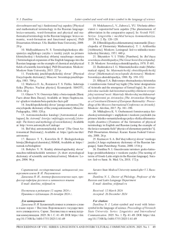 9. Гарифуллина Р. В. Физико-математическая терминология в русском языке: лексико-семантический, словообразовательный и функциональный аспекты: автореф. дис.. канд. филол. наук. Уфа, 2009. 20 с. EDN: ZNYULB