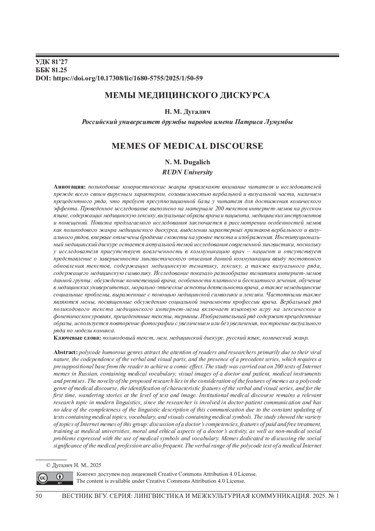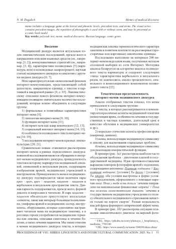 Поликодовые юмористические жанры привлекают внимание читателя и исследователей прежде всего своим вирусным характером, созависимостью вербальной и визуальной части, наличием прецедентного ряда, что требует пресуппозиционной базы у читателя для достижения комического эффекта. Проведенное исследование выполнено на материале 200 текстов интернет-мемов на русском языке, содержащих медицинскую лексику, визуальные образы врача и пациента, медицинских инструментов и помещений. Новизна предлагаемого исследования заключается в рассмотрении особенностей мемов как поликодового жанра медицинского дискурса, выделении характерных признаков вербального и визуального рядов, впервые отмечены бродячие сюжеты науровне текста и изображения. Институциональный медицинский дискурс остается актуальной темой исследования современной лингвистики, поскольку у исследователя присутствует вовлеченность в коммуникацию врач - пациент и отсутствует представление о завершенности лингвистического описания данной коммуникации ввиду постоянного обновления текстов, содержащих медицинскую тематику, лексику, а также визуального ряда, содержащего медицинскую символику. Исследование показало разнообразие тематики интернет-мемов данной группы: обсуждение компетенций врача, особенности платного и бесплатного лечения, обучение в медицинскихуниверситетах, морально-этические аспекты деятельности врача, а также немедицинские социальные проблемы, выраженные с помощью медицинской символики и лексики. Частотными также являются мемы, посвященные обсуждению социальной значимости профессии врача. Вербальный ряд поликодового текста медицинского интернет-мема включает языковую игру на лексическом и фонетическом уровнях, прецедентные тексты, термины. Изобразительный ряд содержит прецедентные образы, используется повторение фотографии с увеличением или без увеличения, построение визуального ряда по модели комикса.