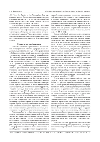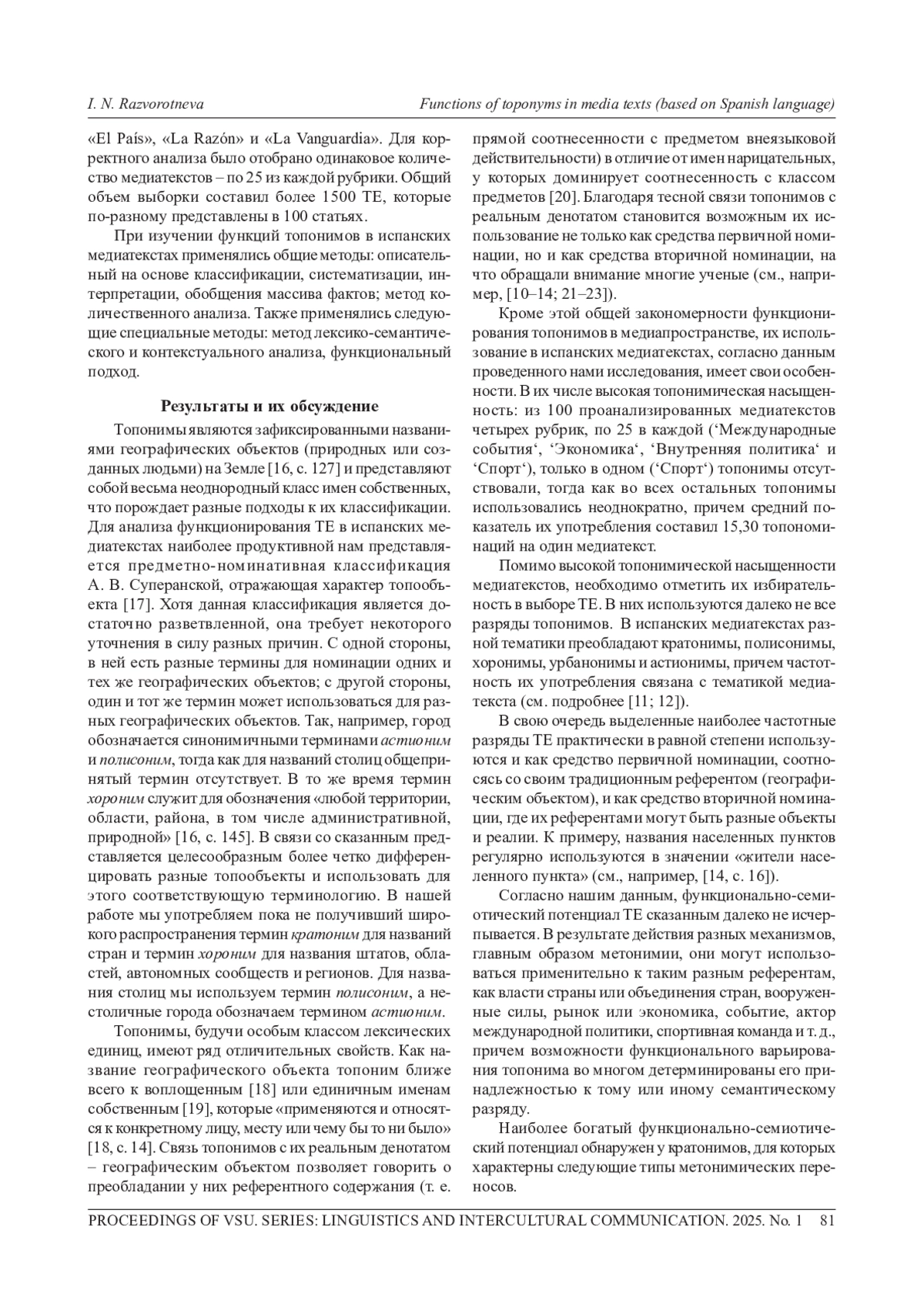 11. Корнева В. В., Разворотнева И. Н. Топонимы в заголовках медиатекстов (на материале испанского языка)//Вестник Воронеж, гос. ун-та. Сер.: Лингвистика и межкультурная коммуникация. 2023. № 4. С. 83-89.