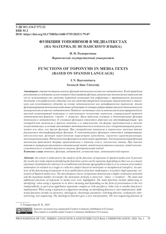 Статья посвящена анализу функций топонимов в испанских медиатекстах. В ней приведены результаты исследования, целью которого было выявить функции, реализуемые топонимами в зависимости от их использования как средства первичной номинации для референции к традиционному реальному денотату (географическому объекту) или как средства вторичной номинации (применительно к единичному или коллективному субъекту на основе метонимических или метафорических переносов). Анализ функционирования топонимов в новостных публикациях из четырех рубрик выявил высокую топонимическую насыщенность испанских медиатекстов. Наиболее частотные классы топонимов демонстрируют более высокий номинативный потенциал и максимальное количество переносов, универсальной является метонимическая формула: «место - жители». Были выделены основные и дополнительные функции топонимов в медиатекстах. К основным функциям относятся адресная или идентифицирующая: при употреблении топонима в прямом значении и в зависимости от формы представления в тексте (самостоятельно, в составе апеллятивно-топотнимического комплекса или с конкретизаторами) реализуется или одна, или другая функция. При употреблении топонима в переносном значении также реализуется идентифицирующая функция. К дополнительным функциям относятся аттрактивная, идеологическая, функция переключения параметров хронотопа, оценочно-характеризующая, текстоорганизующая. Идеологическая функция получает новую трактовку. Текстоорганизующая функция топонимов выделяется впервые применительно к данному классу лексических единиц. При анализе языкового материала применялись описательный метод, метод количественного анализа, метод лексикосемантического и контекстуального анализа, функциональный подход.