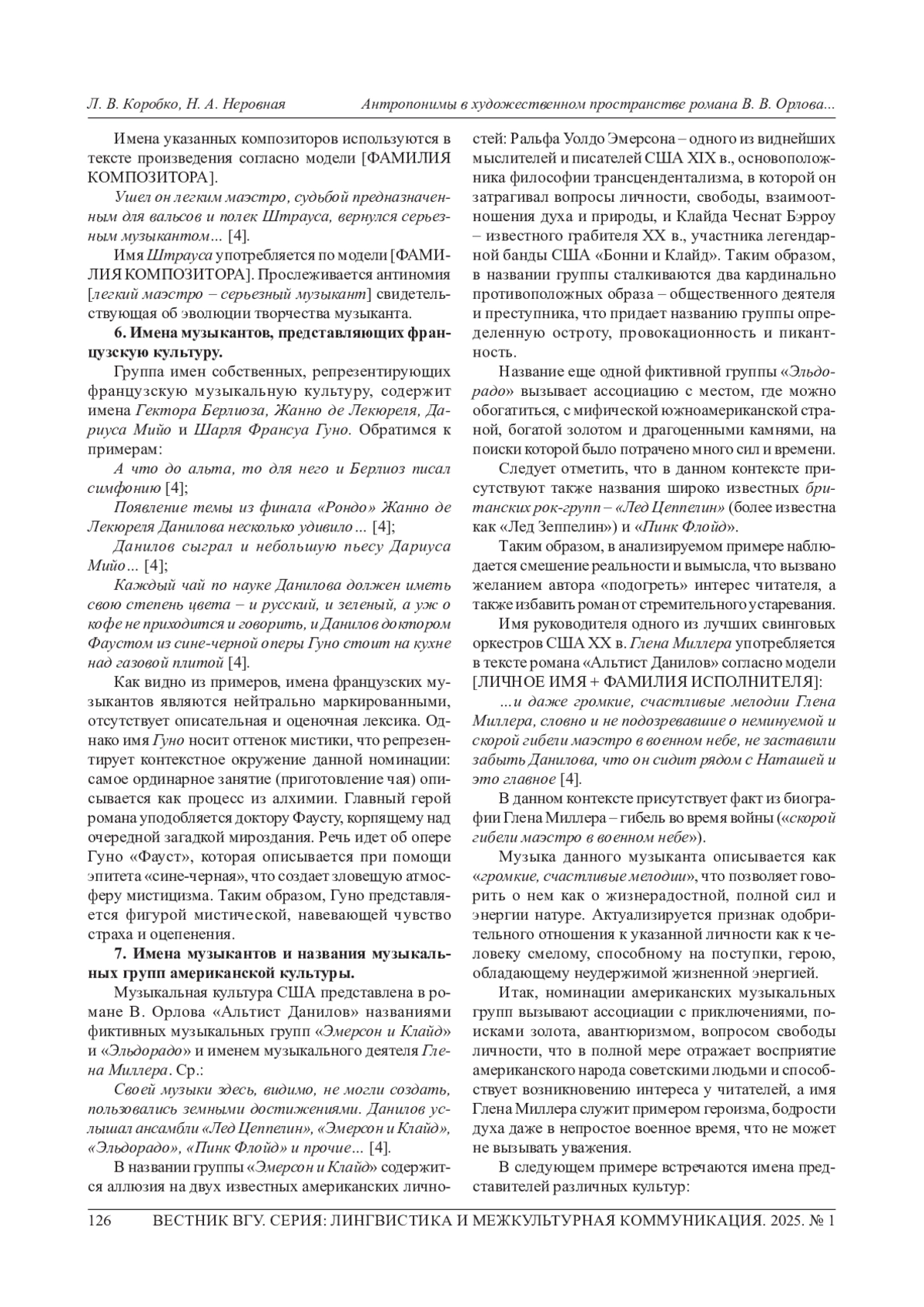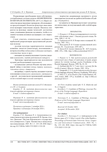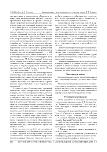 КОРОБКО Л. В., НЕРОВНАЯ Н. А. АНТРОПОНИМЫ В ХУДОЖЕСТВЕННОМ ПРОСТРАНСТВЕ РОМАНА В. В. ОРЛОВА «АЛЬТИСТ ДАНИЛОВ» // ВЕСТНИК ВОРОНЕЖСКОГО ГОСУДАРСТВЕННОГО УНИВЕРСИТЕТА. СЕРИЯ: ЛИНГВИСТИКА И МЕЖКУЛЬТУРНАЯ КОММУНИКАЦИЯ. 2025. № 1