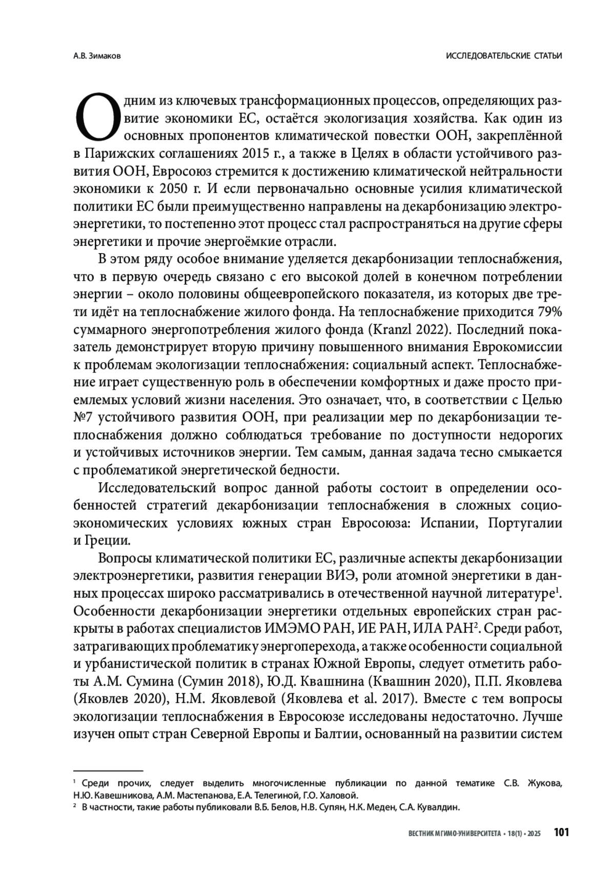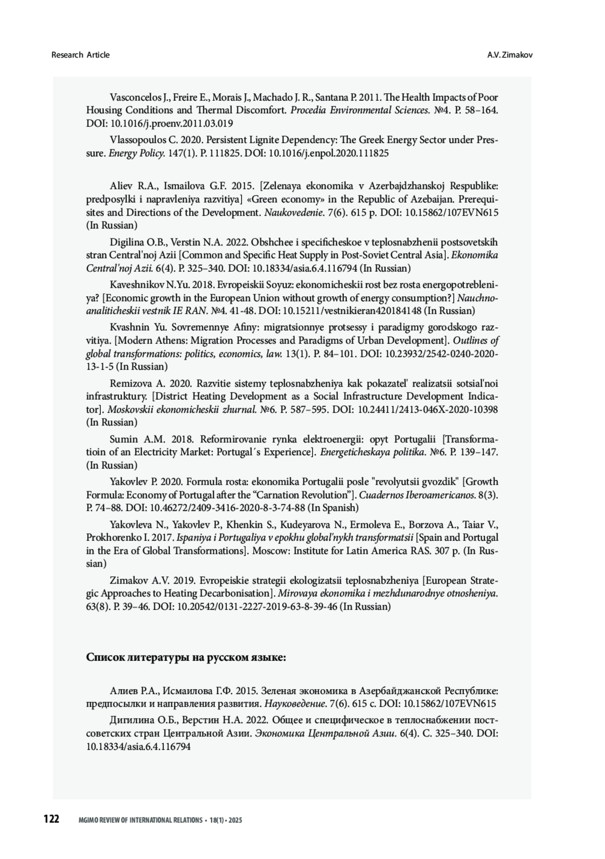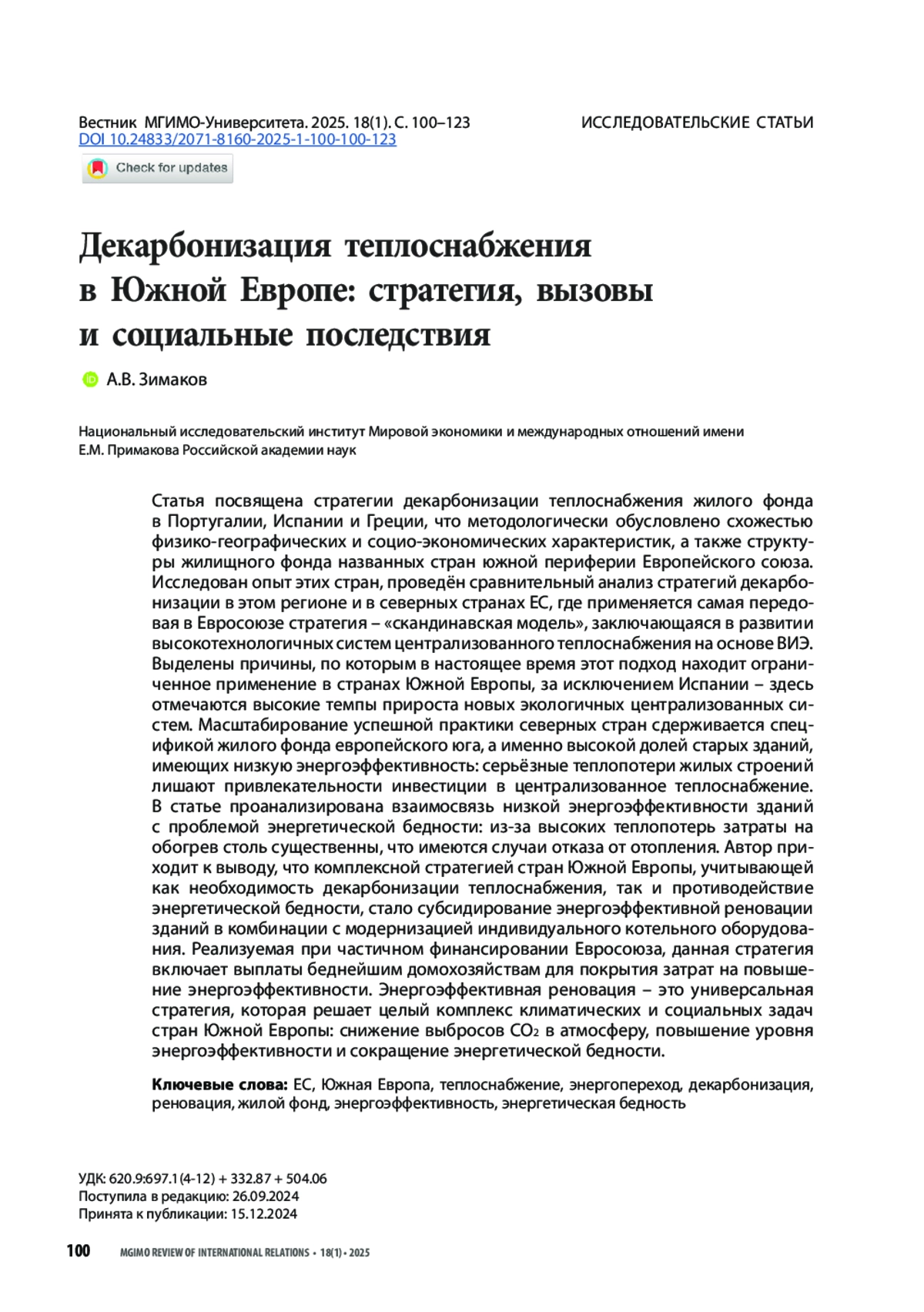 ЗИМАКОВ А. В. ДЕКАРБОНИЗАЦИЯ ТЕПЛОСНАБЖЕНИЯ В ЮЖНОЙ ЕВРОПЕ: СТРАТЕГИЯ, ВЫЗОВЫ И СОЦИАЛЬНЫЕ ПОСЛЕДСТВИЯ // ВЕСТНИК МГИМО-УНИВЕРСИТЕТА. 2025. ТОМ 18, № 1