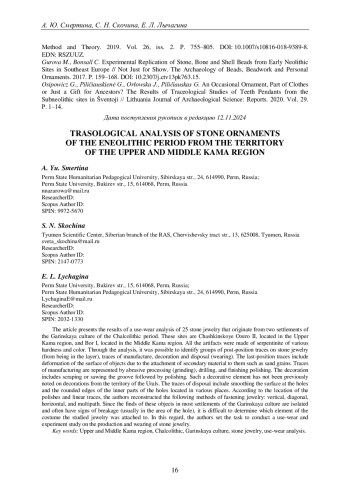 14. Смертина А.Ю., Лычагина Е.Л. Каменные украшения с энеолитических памятников бассейна Средней Камы (по материалам поселения Бор I и стоянки Забойная II) // Тр. Кам. археол.-этнограф. экспедиции. 2022. № 21. С. 42-47. DOI: 10.24412/2658-7637-2022-21-42-47 EDN: AFPCSA