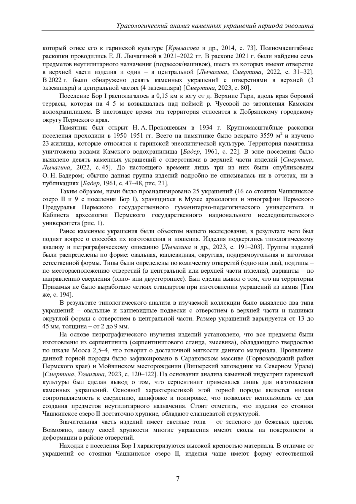 7. Лычагина Е.Л., Смертина А.Ю., Томилина Е.М. Каменные украшения с энеолитических памятников Верхнего и Среднего Прикамья (попытка комплексного анализа) // Поволжская археология. 2023. № 3(45). С. 191-203. DOI: 10.24852/pa2023.3.45.191.203 EDN: ZCZJGU