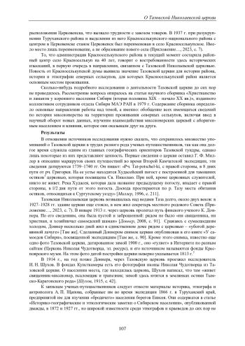 Поводом к изучению истории Тазовской Николаевской церкви послужило одно событие. В декабре 2023 г. Дума Красноселькупского района Ямало-Ненецкого автономного округа приняла решение считать датой основания районного центра села Красноселькуп не 1937 г., как признавалось ранее, а 1897 г., когда статистическая перепись населения народов России зафиксировала рядом с Тазовской Николаевской церковью станок Церковенск (Об установлении даты…, 2023, с. 6). Для справки: Тазовская Николаевская церковь и поселок при ней располагались на берегу р. Таз в 20 км выше устья р. Худосей; расстояние от Церковенска до Красноселькупа составляло 40 км вниз по Тазу.
