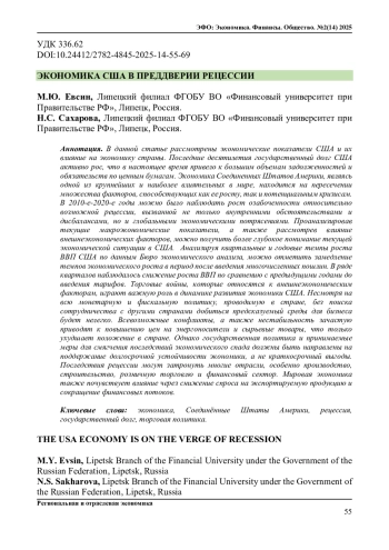 В данной статье рассмотрены экономические показатели США и их влияние на экономику страны. Последние десятилетия государственный долг США активно рос, что в настоящее время привело к большим объемам задолженностей и обязательств по ценным бумагам. Экономика Соединенных Штатов Америки, являясь одной из крупнейших и наиболее влиятельных в мире, находится на пересечении множества факторов, способствующих как ее росту, так и потенциальным кризисам. В 2010-е-2020-е годы можно было наблюдать рост озабоченности относительно возможной рецессии, вызванной не только внутренними обстоятельствами и дисбалансами, но и глобальными экономическими потрясениями. Проанализировав текущие макроэкономические показатели, а также рассмотрев влияние внешнеэкономических факторов, можно получить более глубокое понимание текущей экономической ситуации в США. Анализируя квартальные и годовые темпы роста ВВП США по данным Бюро экономического анализа, можно отметить замедление темпов экономического роста в период после введения многочисленных пошлин. В ряде кварталов наблюдалось снижение роста ВВП по сравнению с предыдущими годами до введения тарифов. Торговые войны, которые относятся к внешнеэкономическим факторам, играют важную роль в динамике развития экономики США. Несмотря на всю монетарную и фискальную политику, проводимую в стране, без поиска сотрудничества с другими странами добиться предсказуемый среды для бизнеса будет нелегко. Всевозможные конфликты, а также нестабильность зачастую приводят к повышению цен на энергоносители и сырьевые товары, что только ухудшает положение в стране. Однако государственная политика и принимаемые меры для смягчения последствий экономического спада должны быть направлены на поддержание долгосрочной устойчивости экономики, а не краткосрочный выгоды. Последствия рецессии могут затронуть многие отрасли, особенно производство, строительство, розничную торговлю и финансовый сектор. Мировая экономика также почувствует влияние через снижение спроса на экспортируемую продукцию и сокращение финансовых потоков.