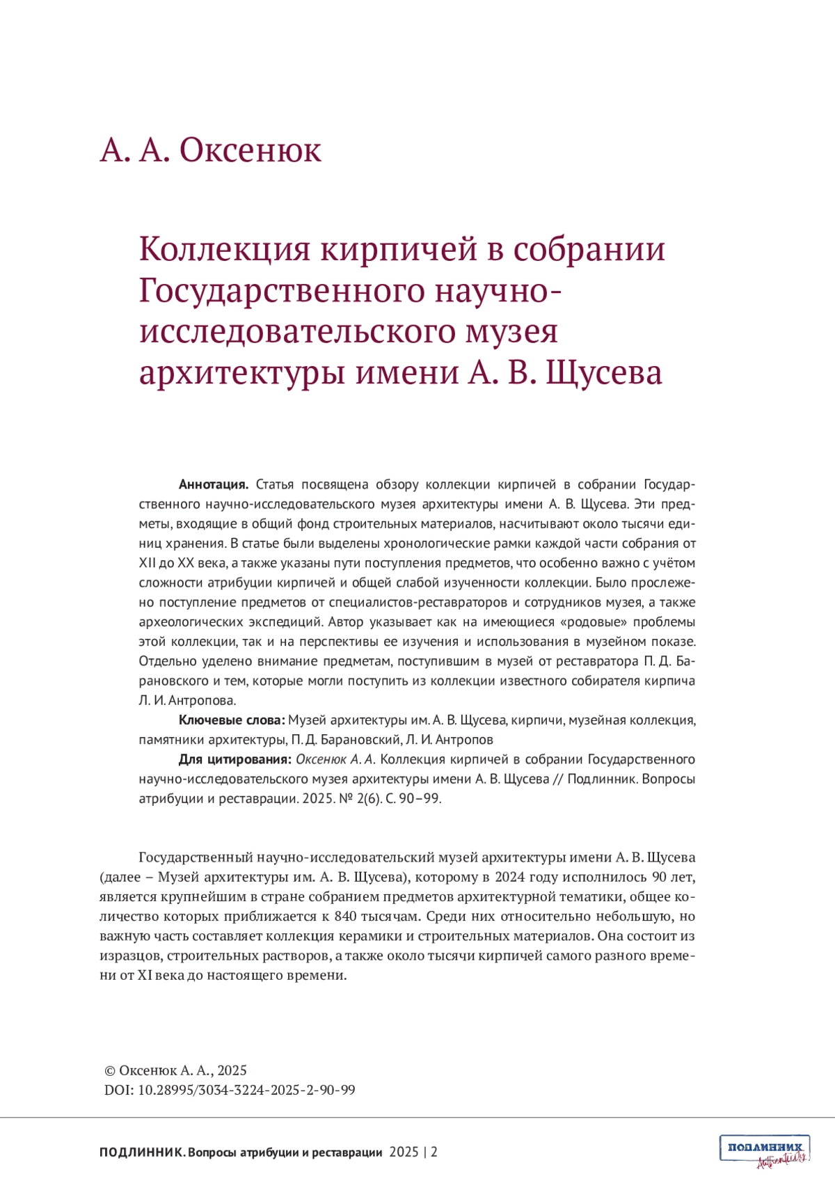 4. Оксенюк А. А. Изразцы из коллекции архитектора-реставратора П. Д. Барановского в собрании Государственного научно-исследовательского музея архитектуры им. А. В. Щусева // Архитектурная керамика мира. 2022. № 7. С. 15-23.