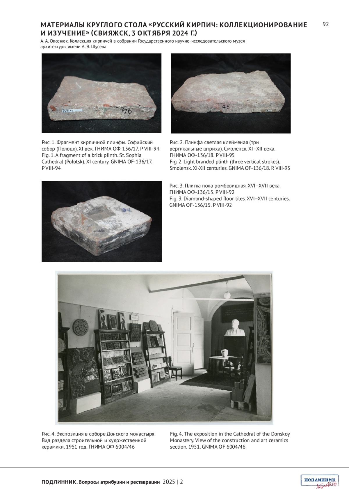 Государственный научно-исследовательский музей архитектуры имени А. В. Щусева (далее – Музей архитектуры им. А. В. Щусева), которому в 2024 году исполнилось 90 лет, является крупнейшим в стране собранием предметов архитектурной тематики, общее количество которых приближается к 840 тысячам. Среди них относительно небольшую, но важную часть составляет коллекция керамики и строительных материалов. Она состоит из изразцов, строительных растворов, а также около тысячи кирпичей самого разного времени от XI века до настоящего времени.