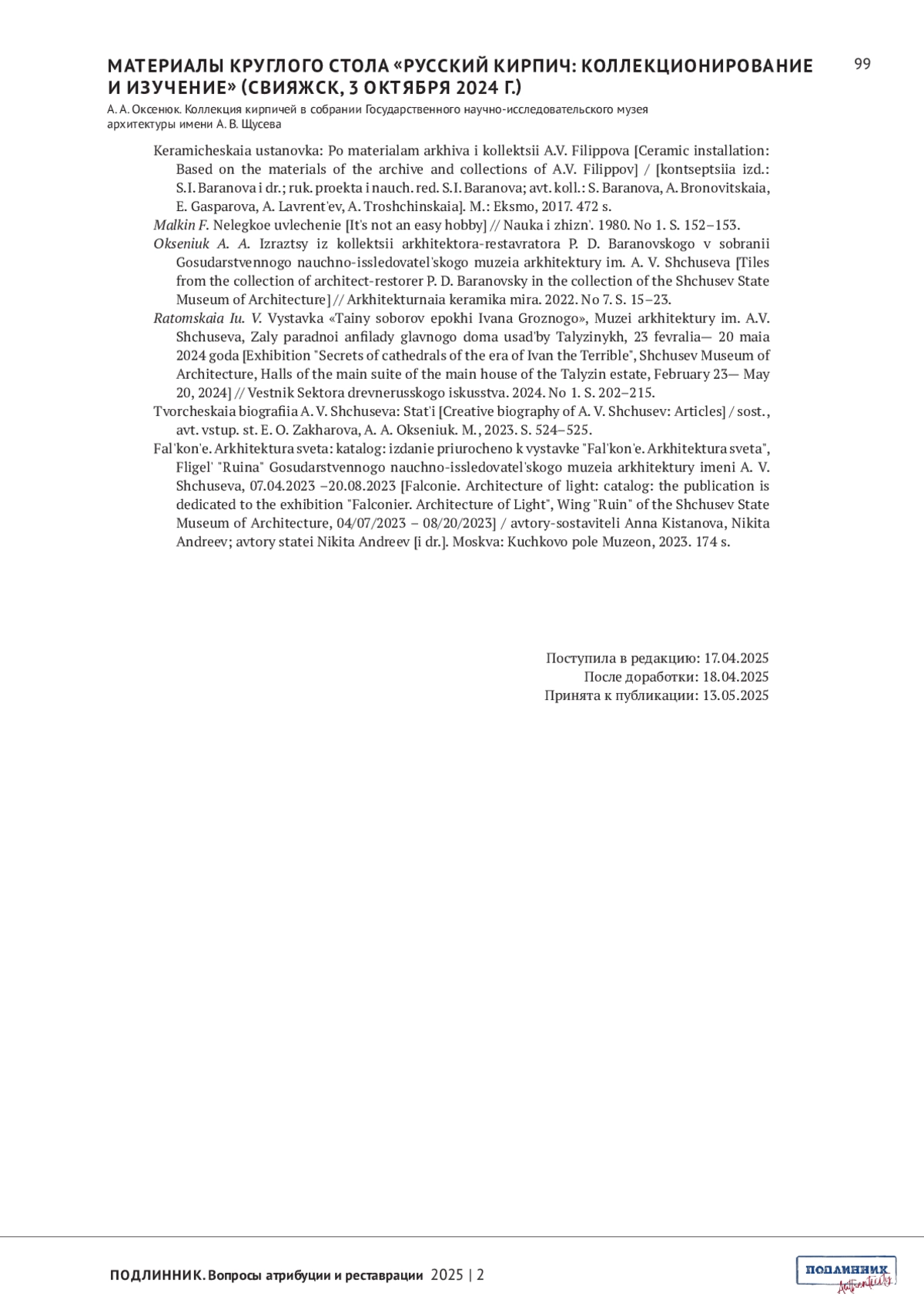 1. Баранова С. И. Увидеть невидимое: концепция экспозиции “Открытое хранение фонда керамики и строительных материалов ГНИМА им. А. В. Щусева” // Вестник РГГУ. Серия “Литературоведение. Языкознание. Культурология”. 2021. № 9. С. 67-86.