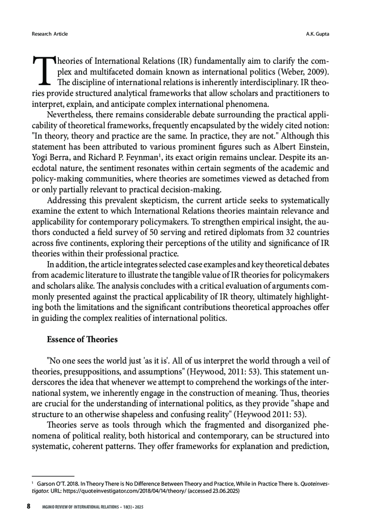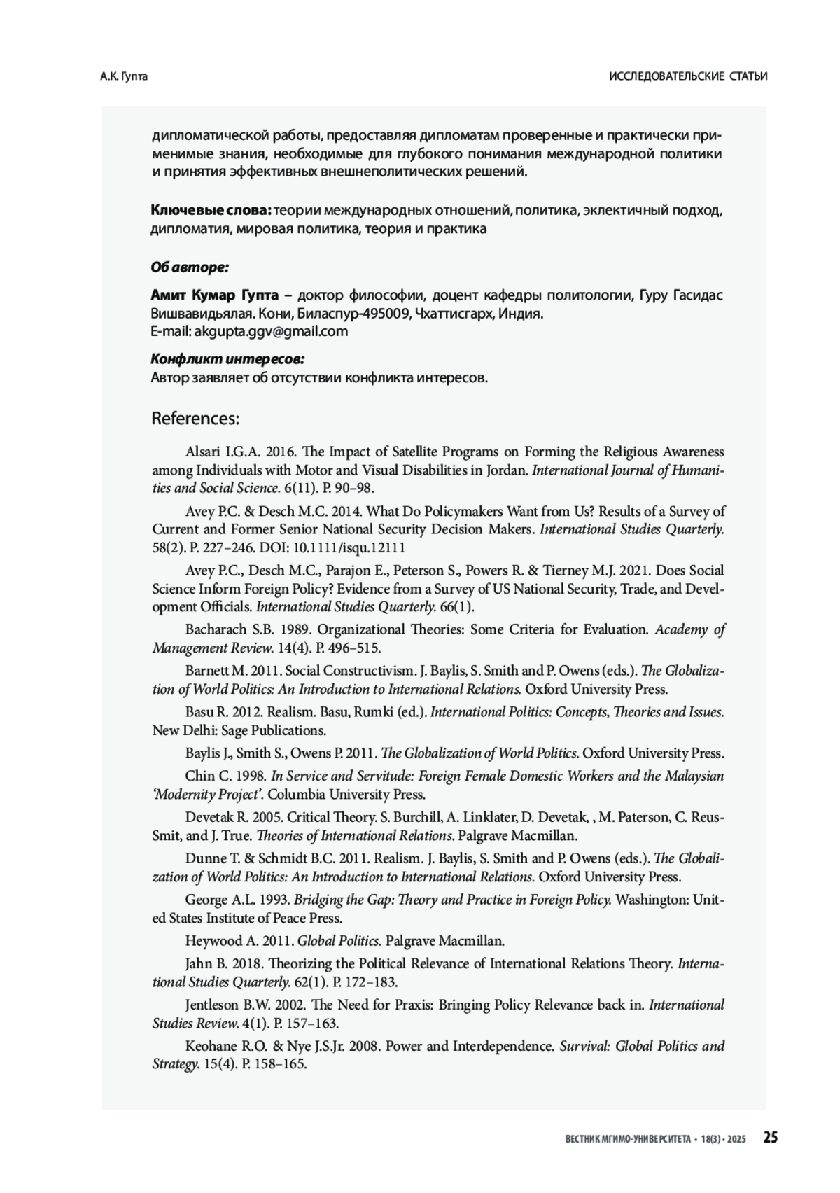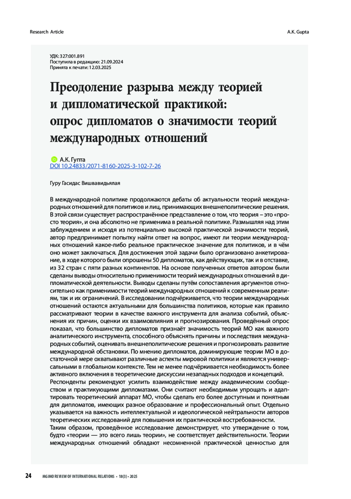 ГУПТА А. К. ПРЕОДОЛЕНИЕ РАЗРЫВА МЕЖДУ ТЕОРИЕЙ И ДИПЛОМАТИЧЕСКОЙ ПРАКТИКОЙ: ОПРОС ДИПЛОМАТОВ О ЗНАЧИМОСТИ ТЕОРИЙ МЕЖДУНАРОДНЫХ ОТНОШЕНИЙ // ВЕСТНИК МГИМО-УНИВЕРСИТЕТА. 2025. ТОМ 18, № 3