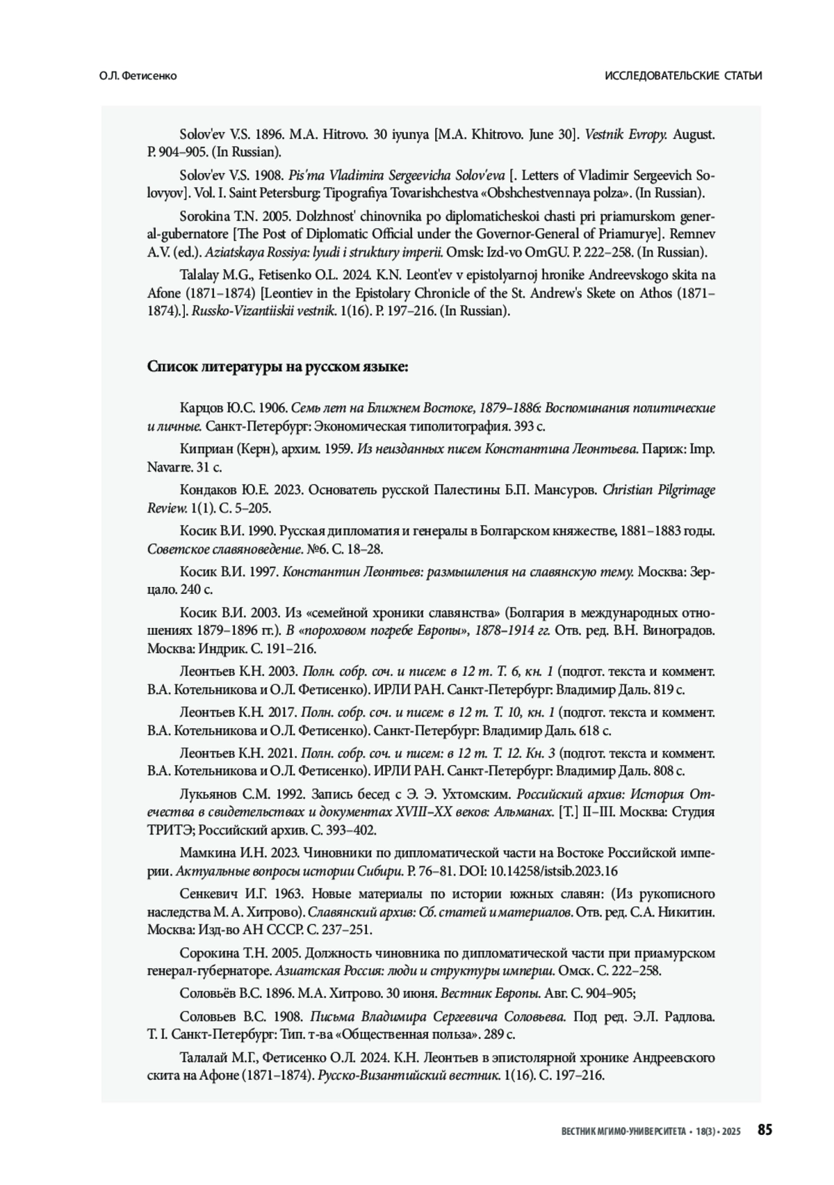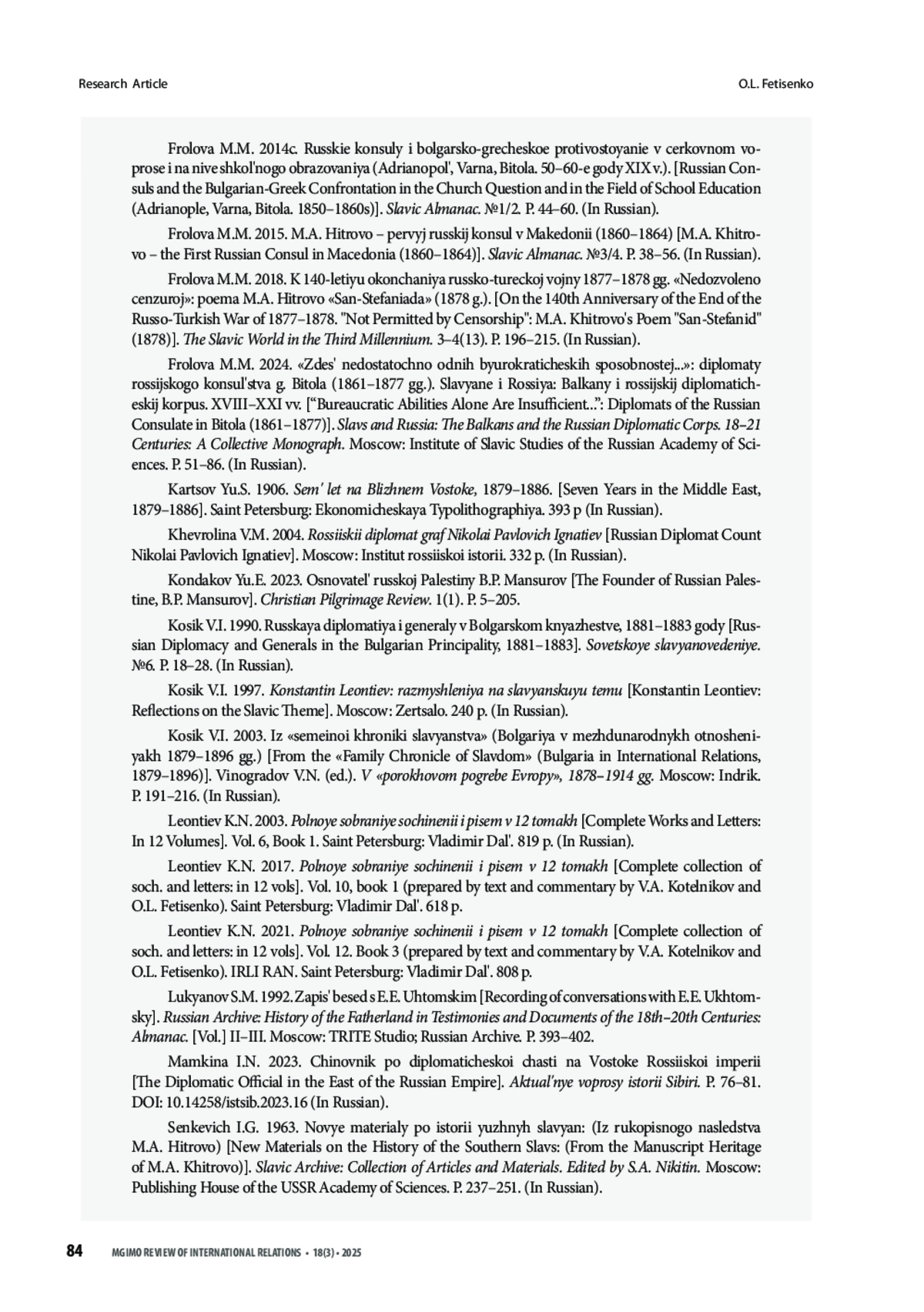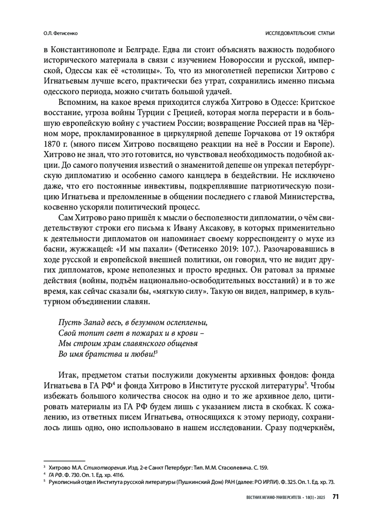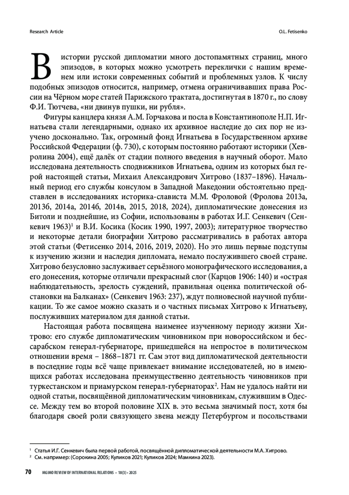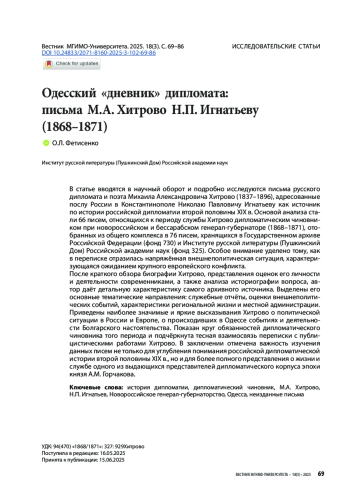 ФЕТИСЕНКО О. Л. ОДЕССКИЙ «ДНЕВНИК» ДИПЛОМАТА: ПИСЬМА М. А. ХИТРОВО Н. П. ИГНАТЬЕВУ (1868–1871) // ВЕСТНИК МГИМО-УНИВЕРСИТЕТА. 2025. ТОМ 18, № 3